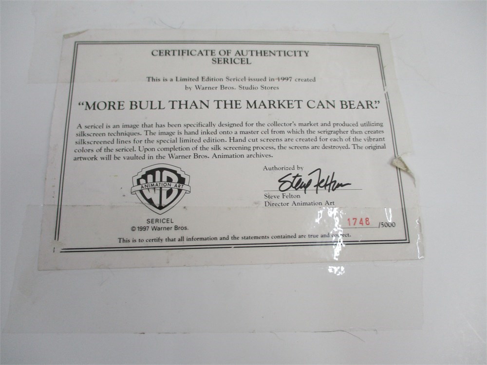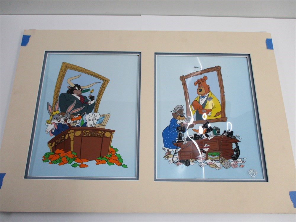 A wonderful loose Sericel of two, with Warner Bros. characters, Bugs Bunny, Dafffy Duck and "More Bull than the market can Bear".  Each cell measures 10x13, dated 1997 and comes with Certificate of Authenticity and numbered 1748/5000.  They are loosely mounted on foam core.