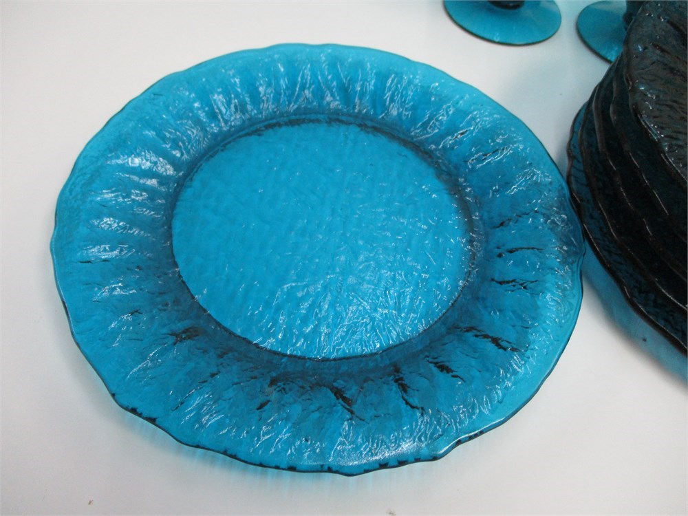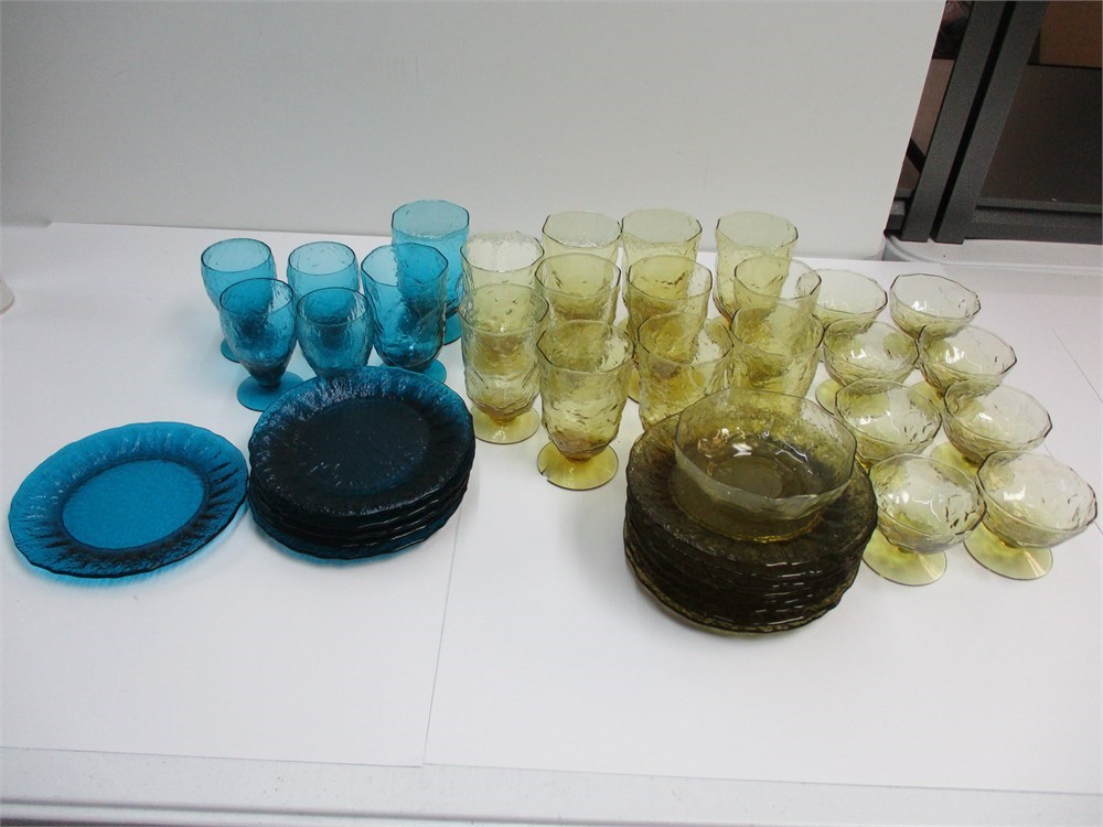 A Vintage 40 Piece Collection of Empoli Italian Art Glass Tableware Lot, Amber & Turquoise Color.  Turquoise set consists of 6 blue plates, 4 juice glasses and 2 goblets. Amber set consists of 8 plates, 11 goblets, 8 sherbets, 1 bowl.  All in very nice condition.
