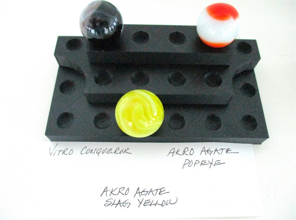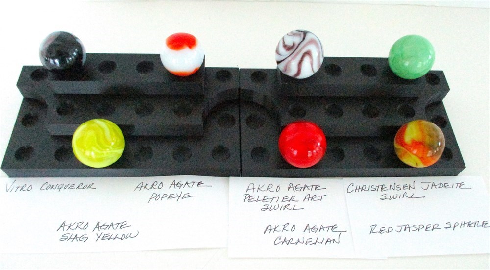 This is a wonderful 7 piece collection of Vintage Marbles including Vitro Conqueror, Akro Agate Popeye, Akro Agate Slag Yello, Akro Agate Peletier Swirl, Akro Agate Carnelian, Christensen Jadeite Swirl and Red Jasper Sphere.  All in wonderful condition with only normal age related wear, ranging is diameter of .75 - 1".
