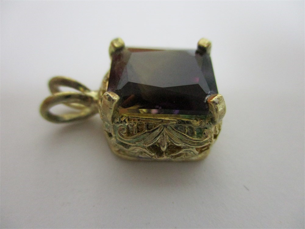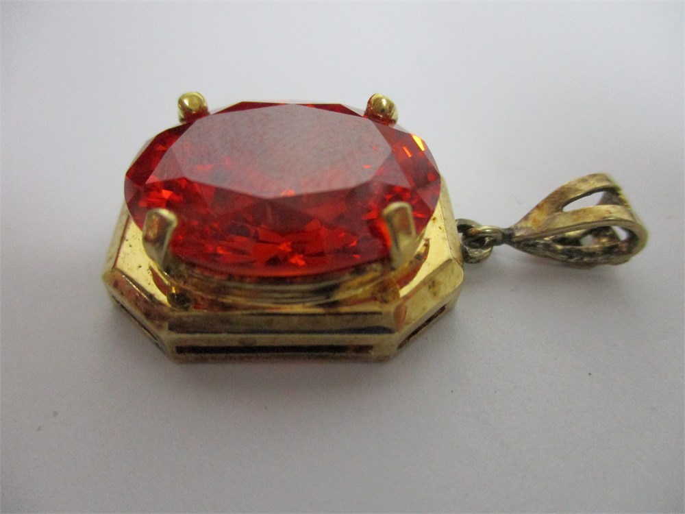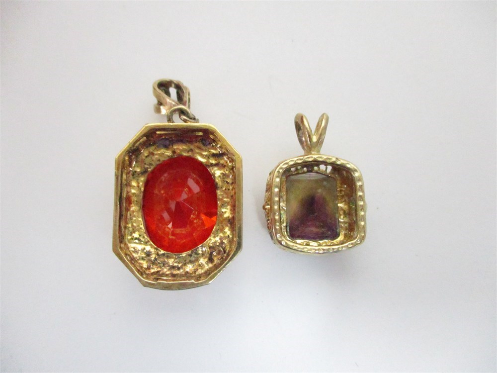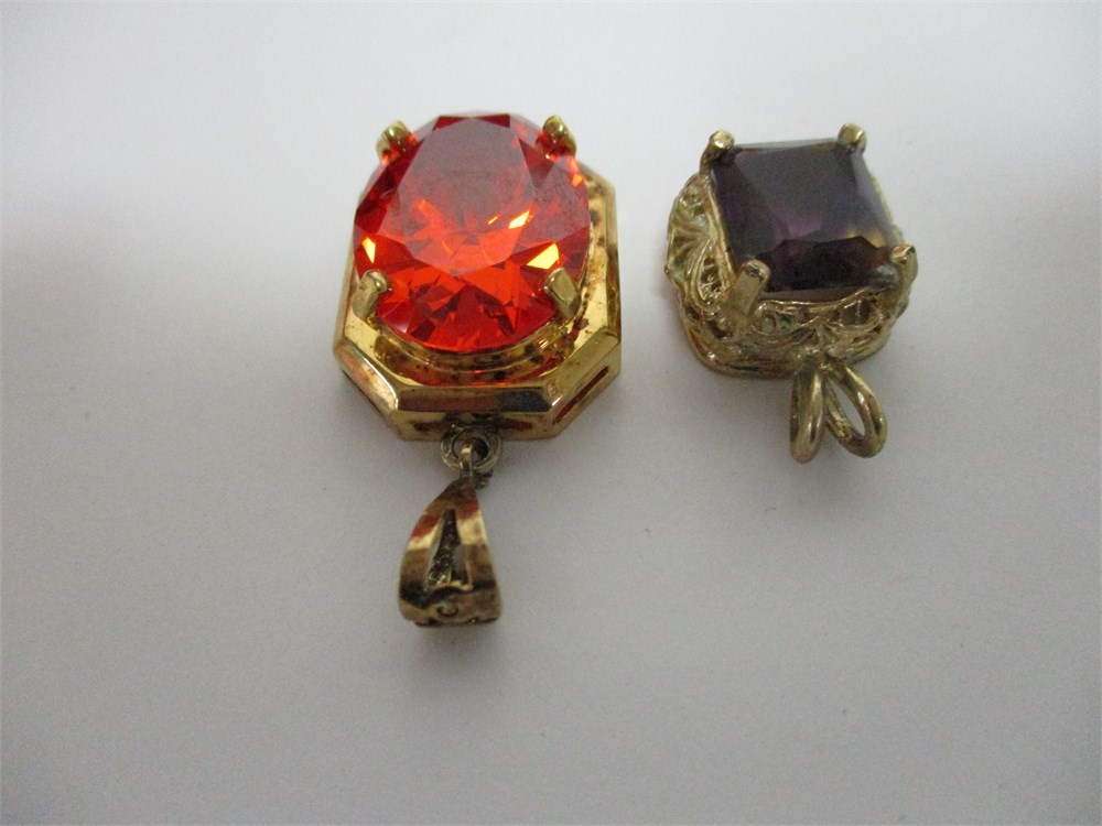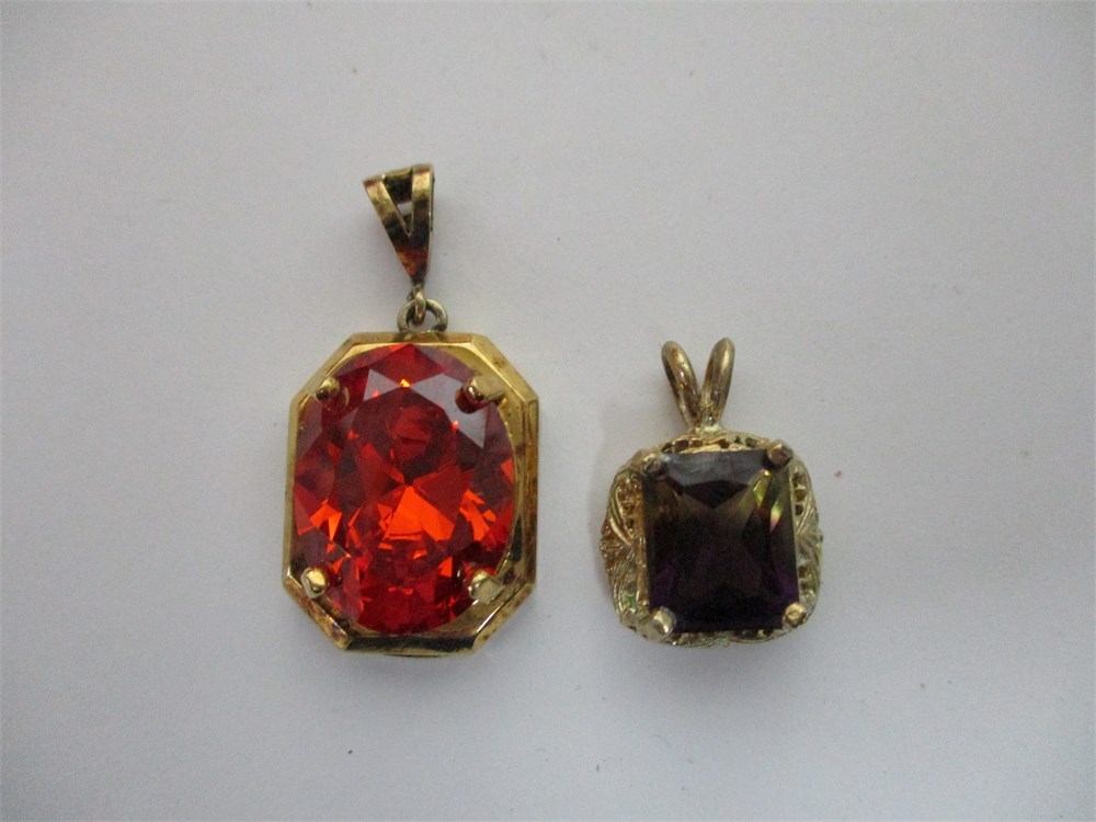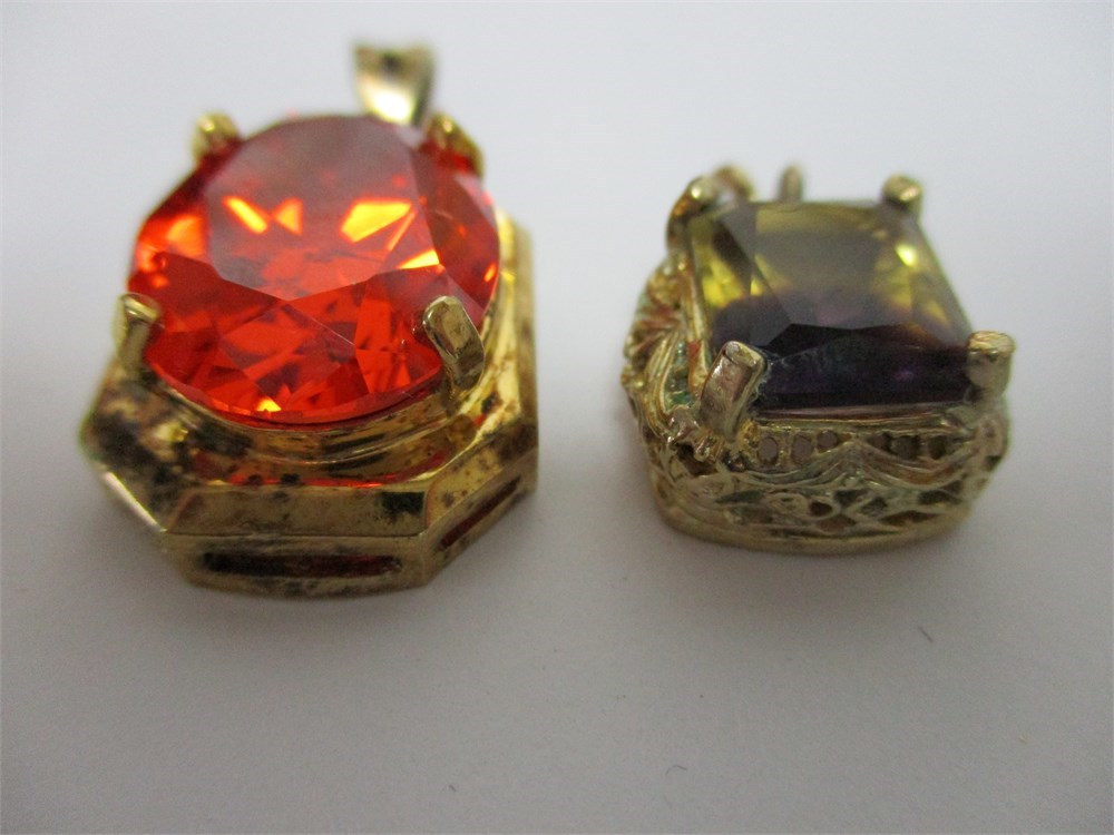 This vintage Lot of  2 Pendants includes a larger faceted orange CZ in a 4 prong setting that sits on a high bezel of Gold over Sterling.  It has a larger bail that will accommodate a variety of chains choices.  The smaller pendant looks like a Mystic topaz. It sits in a 4 prong setting in a nice high bezel of Gold over Sterling.  It has a large split bail that will accommodate a variety of chain choices. Both are in very nice condition with only normal age related wear.