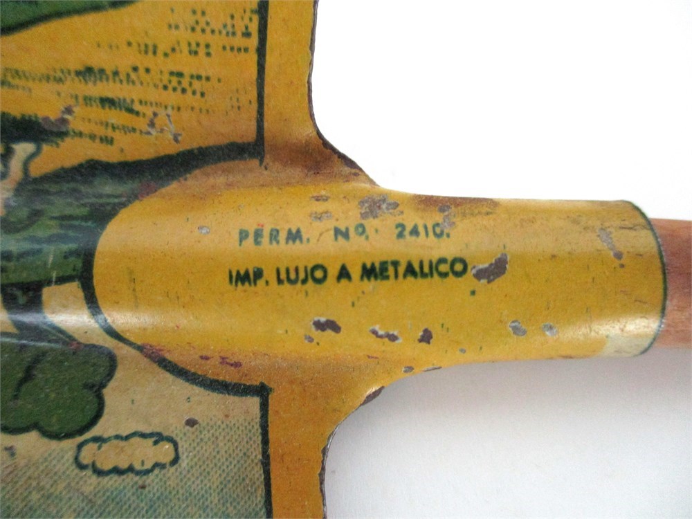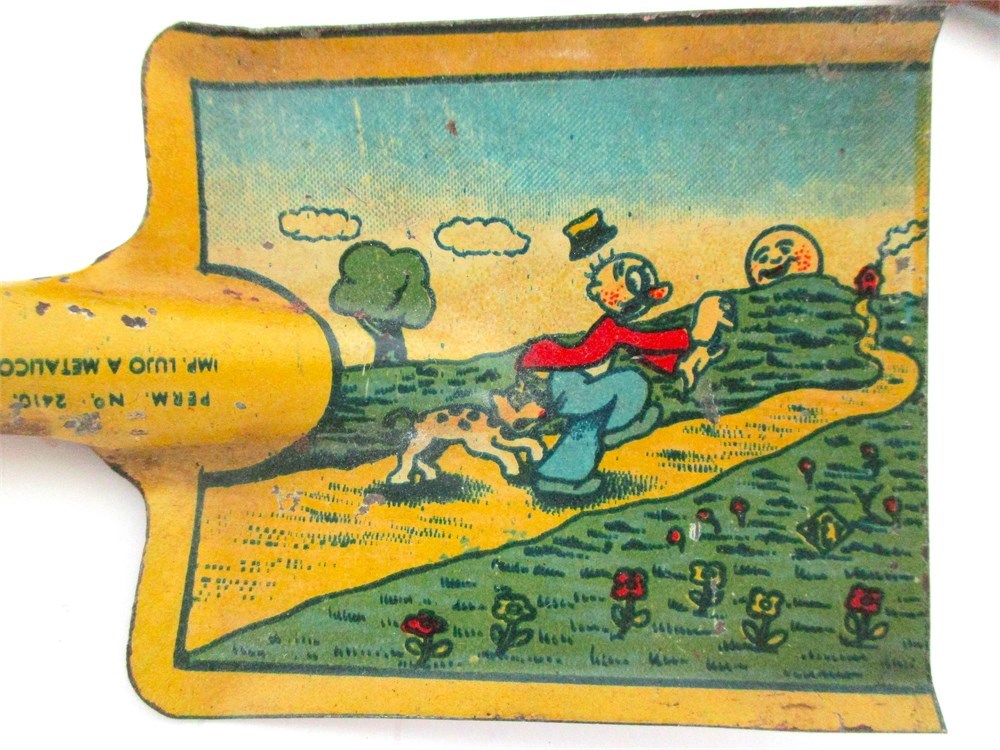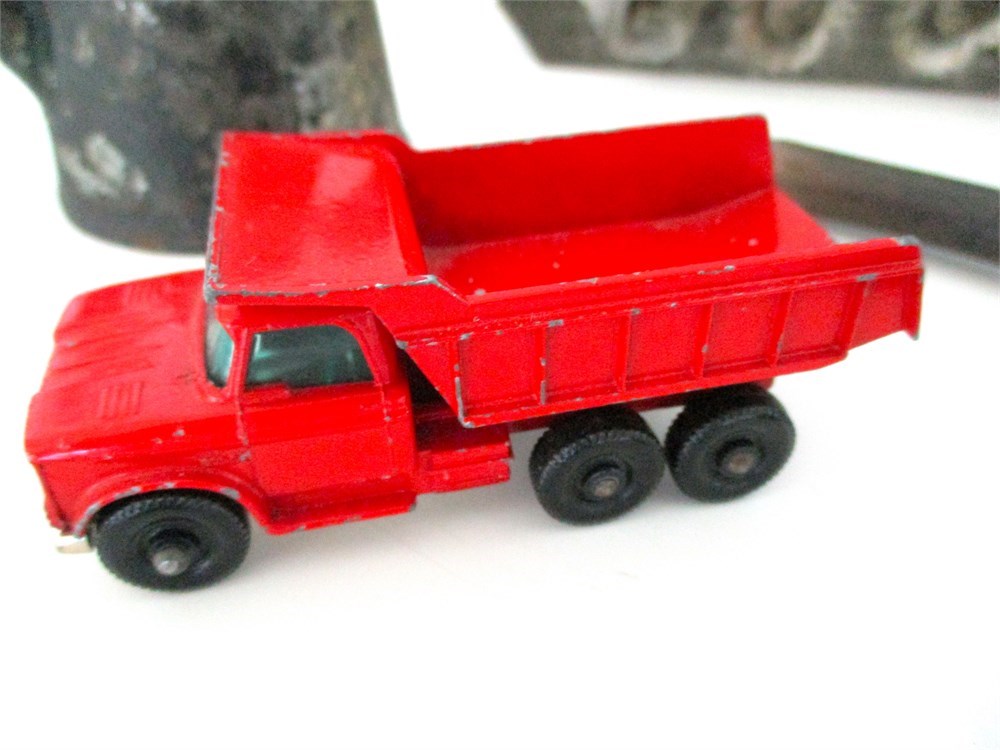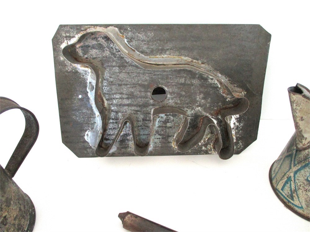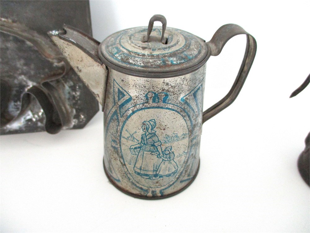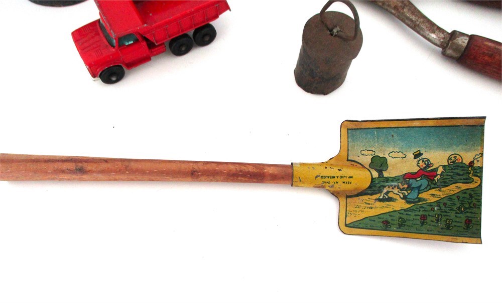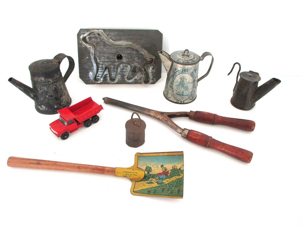 This Lot consists of a Miscellaneous grouping of Child's Toys, Red Matchbox Dumper Truck, Child's Tin Shovel with Graphics, Child's Tin Coffee Pot with Mother and Daughter Scenes, a Dog Cookie Cutter with one part of the handle broken but still useable, Antique Curling Iron, Antique late 1800's Teapot shape Miner's Lamp, Goat Bell and a Child's Tin Coffee Pot.  All pieces are in good antique and vintage condition and great for collectors.