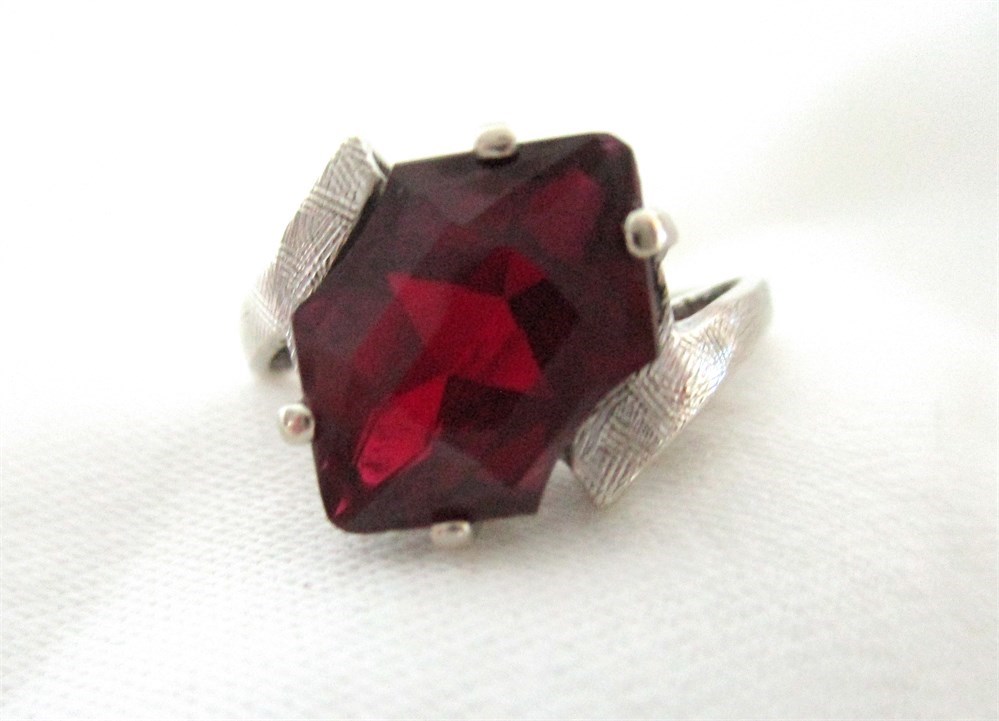 This is a Beautiful,10K White Gold Ring with large faceted Garnet Stone.  The facets on this Garnet stone is often referred to as an Octagon cut or a Step cut and sits at an angle, in a 4 prong setting on top of a nice high open work gallery, it has alot of brilliance and captures the light beautifully. The Band has some lovely etching on the Shank.  It is a size 8. This is a lovely piece, perfect for a January birthday and a great Christmas gift.