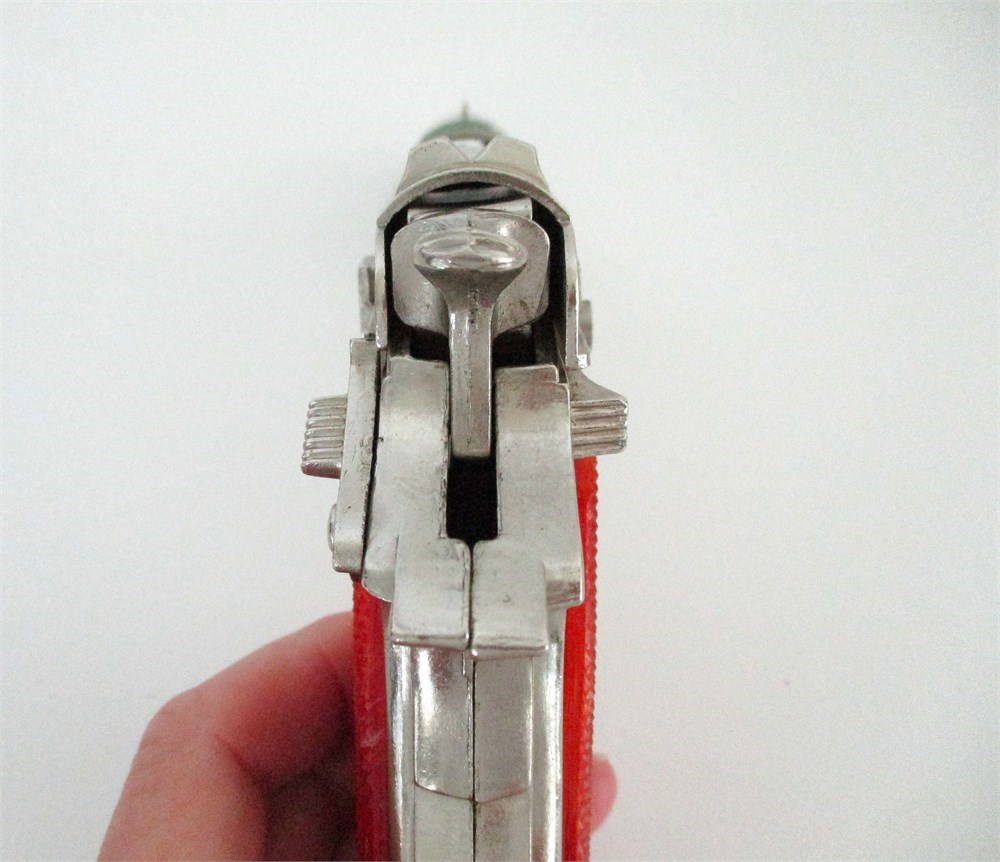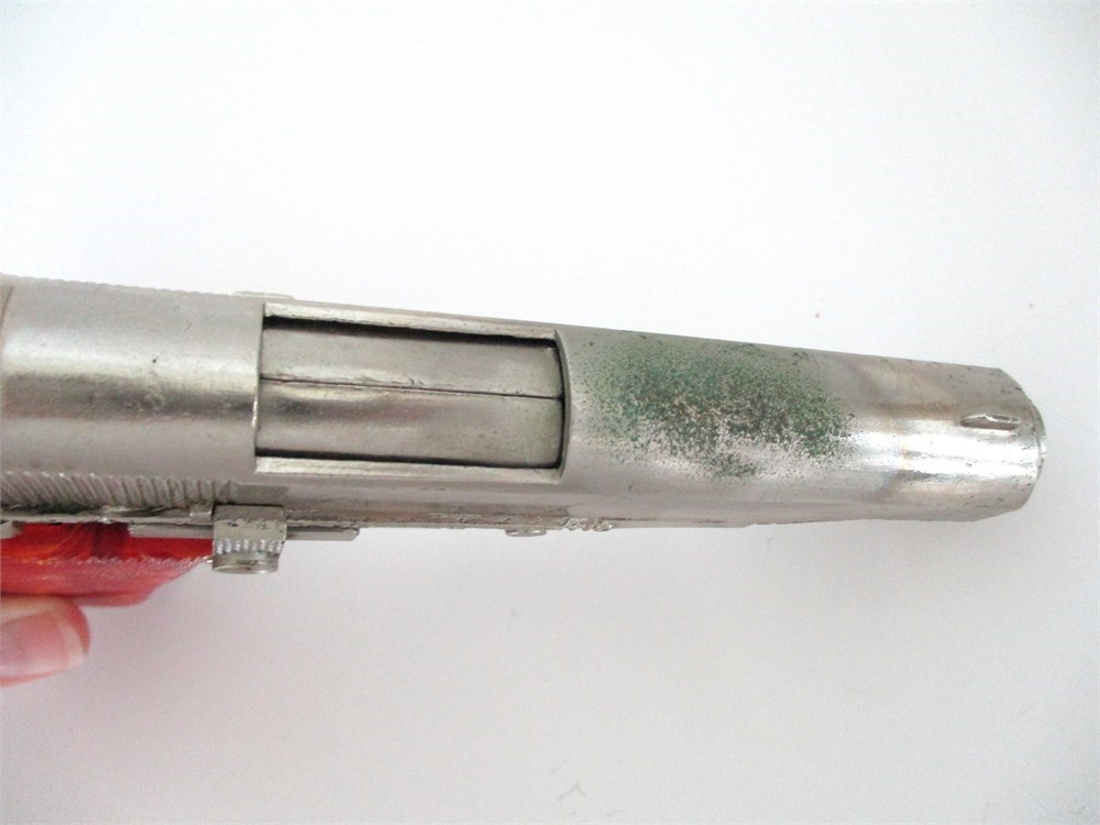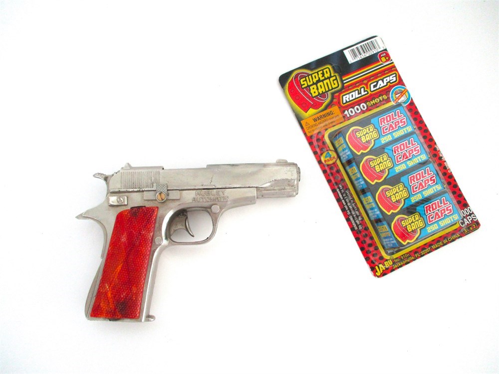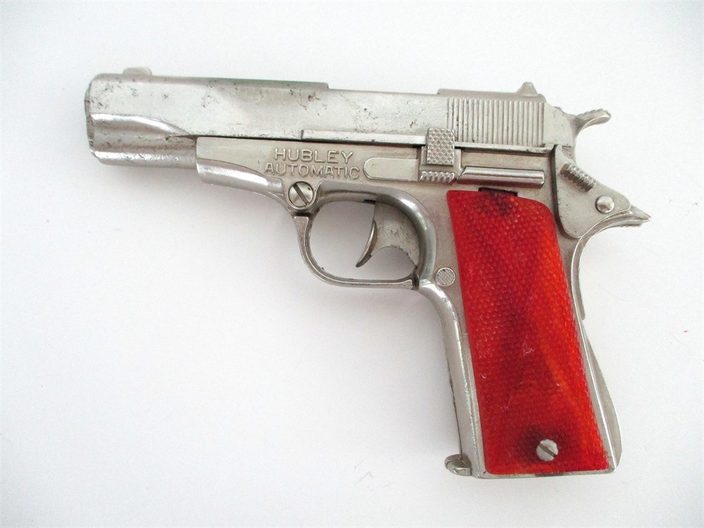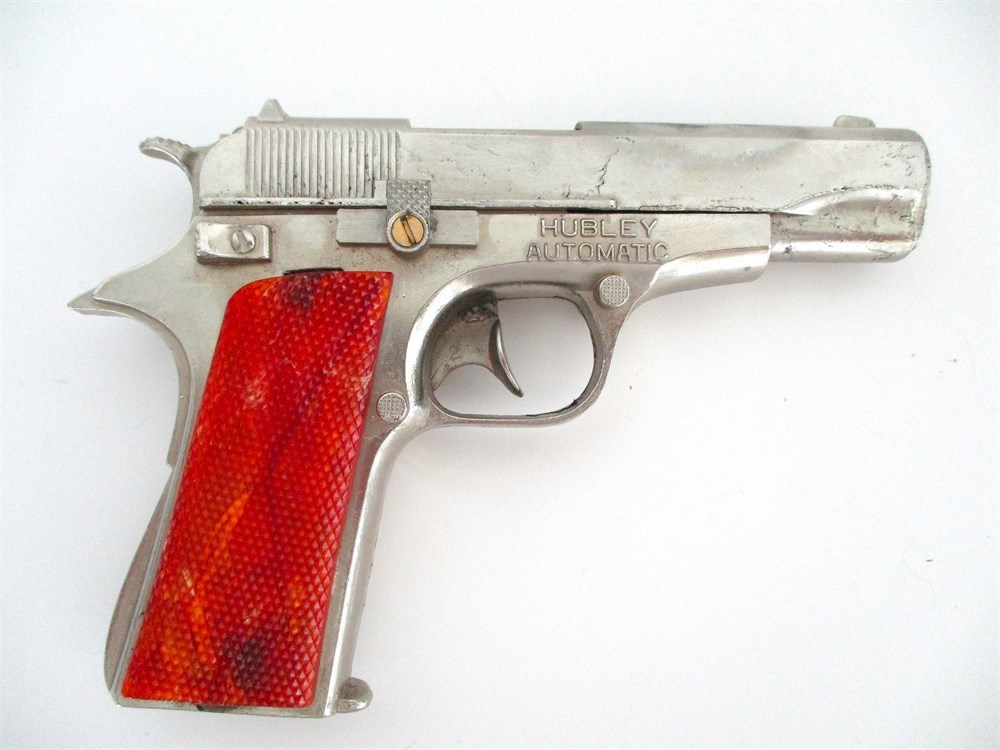 This is a very nice vintage HUBLEY .45 Auto Toy Cap Gun. Nice nickel plated finish, and grips. Some mild surface wear and some corrosion on the top of the barrel, normal age related wear, but no chips/cracks/repairs. Lock spring is good, slide works nice as do trigger and hammer with a strong snap.  It works at time of listing.  Great looking .45.  Also comes with a unopened box of Super Bang Roll Caps, 1000 shots.