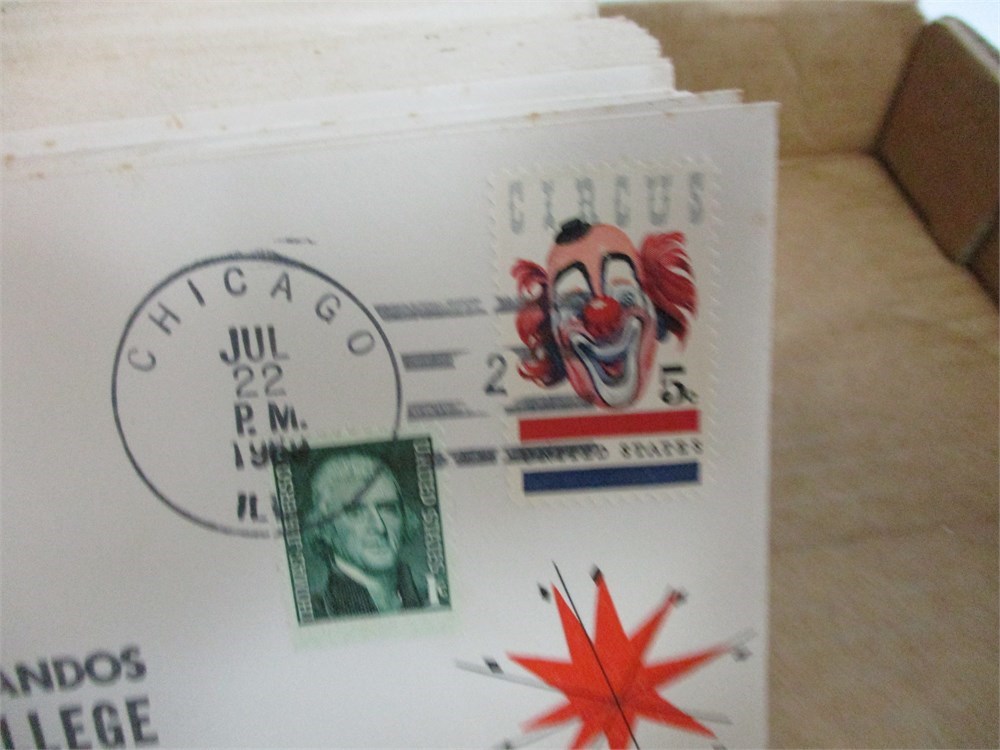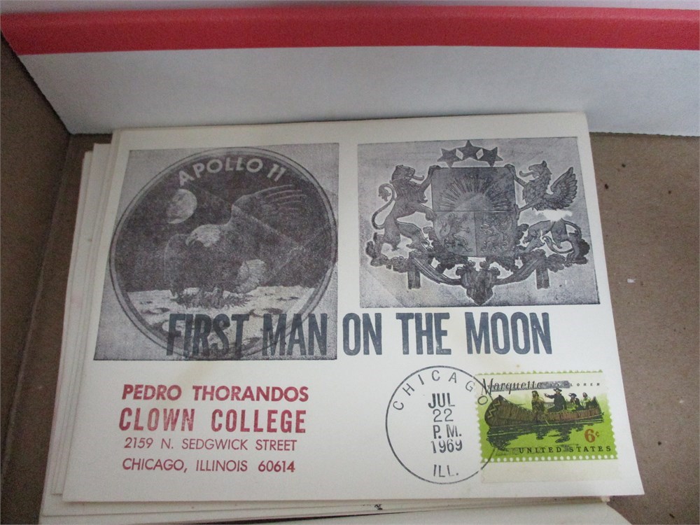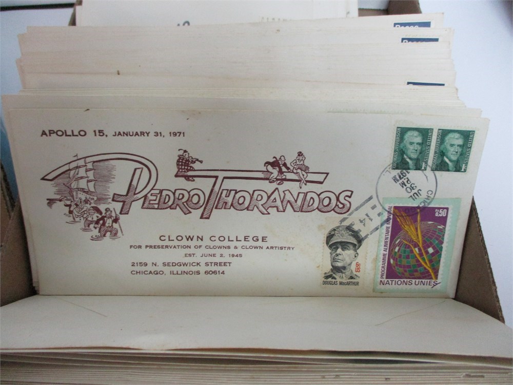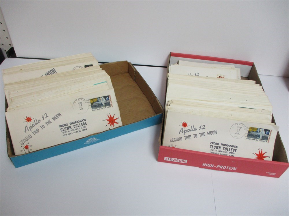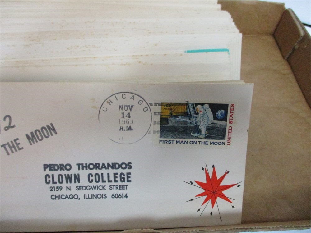 A wonderful Box Lot of Envelopes to Pedro Thorandos Clown College, Chicago Ill, Apollo 12.  The stamps are very cool and collectible along with great graphics.