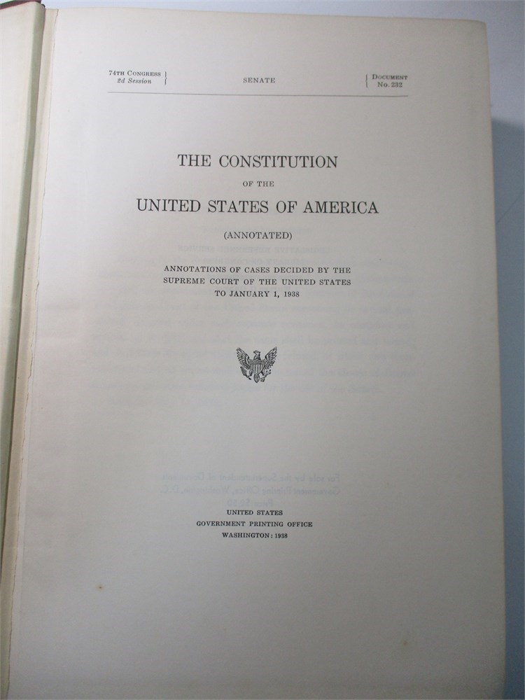 Single Volume of Constitution of the United States, 1938, 74th Congress, 2nd Session, annotations of cases decided by the Supreme Court of the U.S. to January 1, 1938. It is in wonderful vintage condition and very gently used.