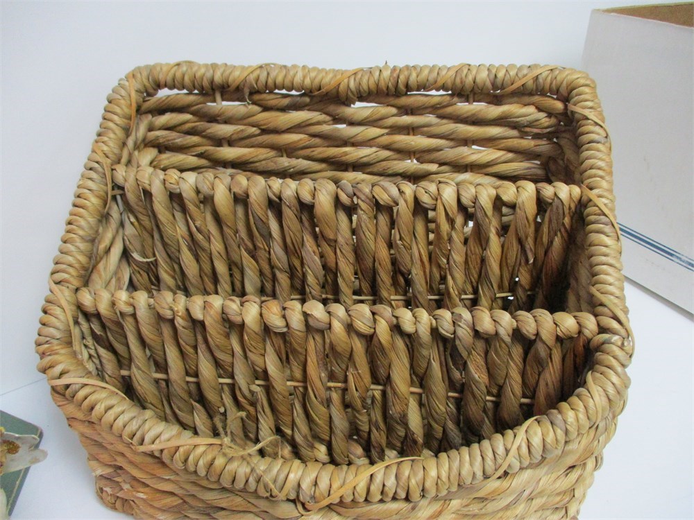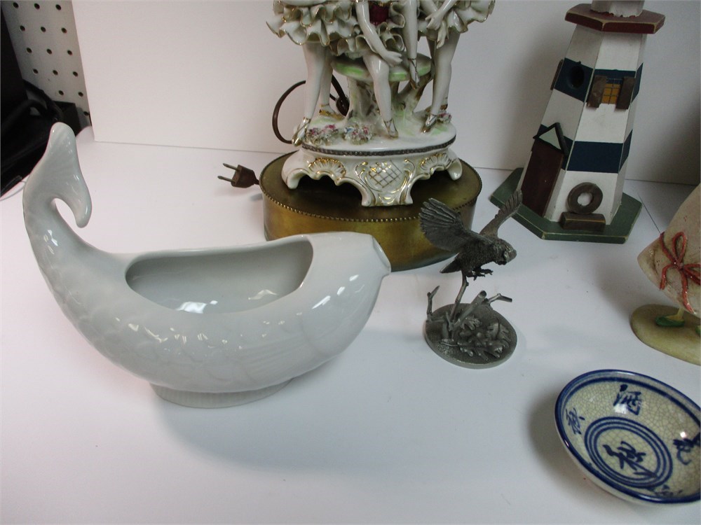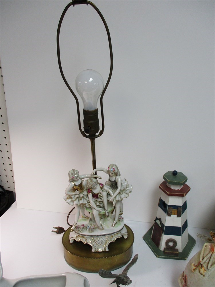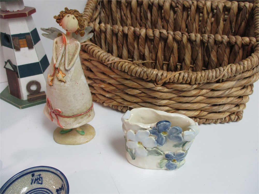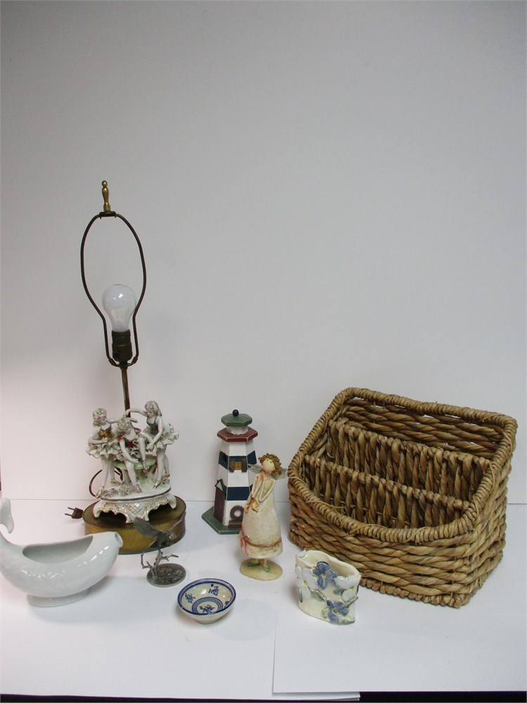 This Lot consists of a ceramic figural lamp, no shade, a wicker letter file and assorted decorator pieces.  all in good vintage condition with only normal age related wear.