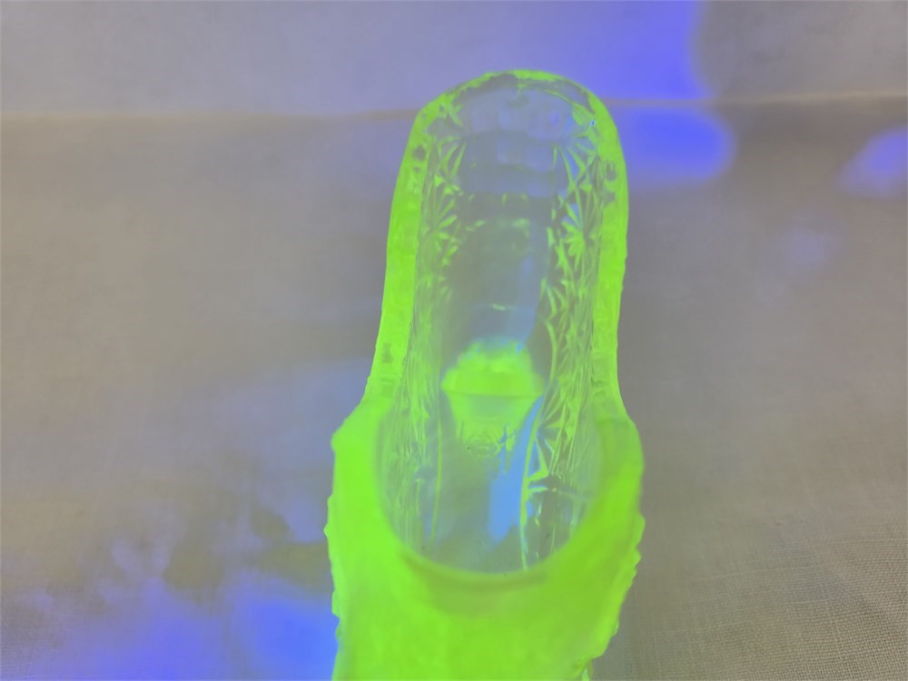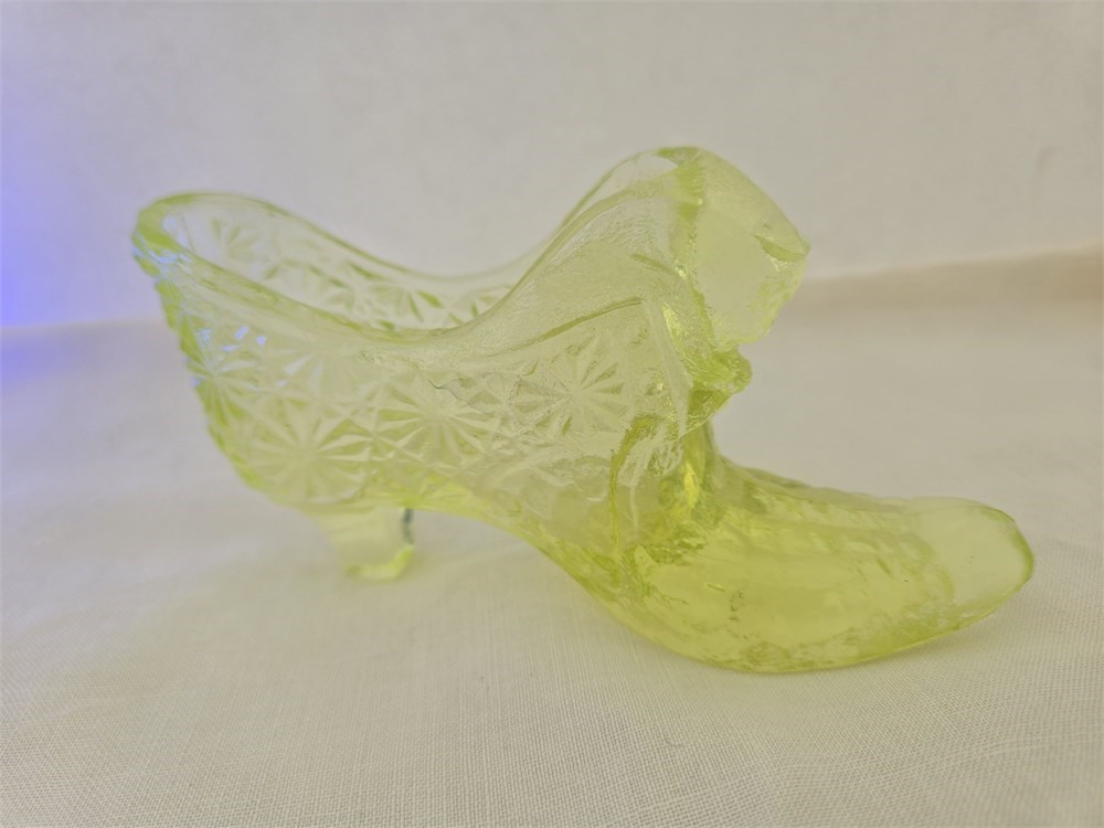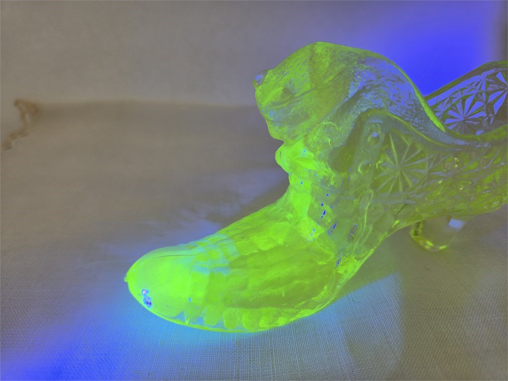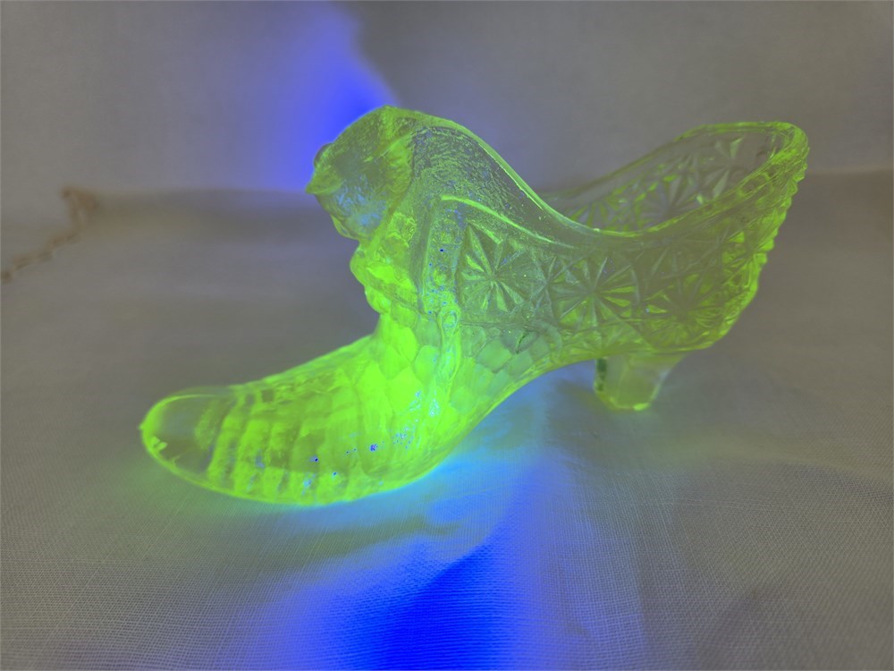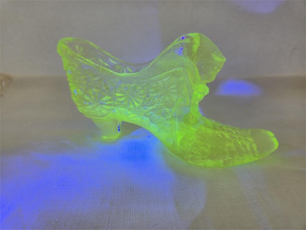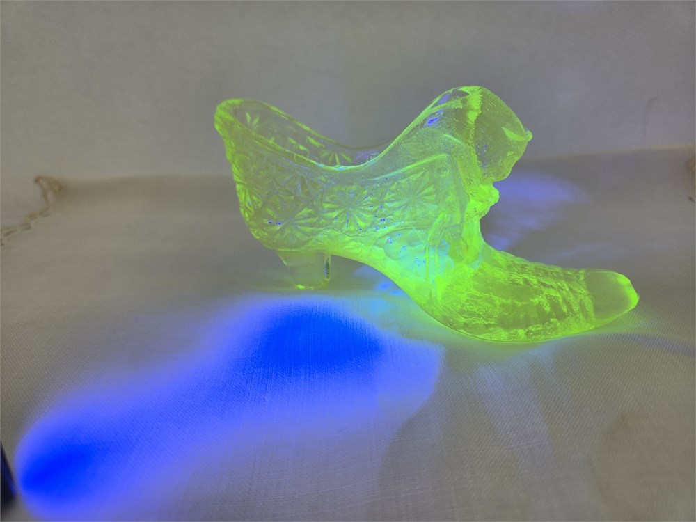 Charming vintage uranium glass “Cat in Shoe” figurine by Boyd Glass Company, Cambridge, Ohio, marked with the B in diamond logo. This delightful piece features a cat perched atop a Victorian-style shoe in the Daisy and Button pattern. Made of genuine uranium (Vaseline) glass that glows a brilliant neon green under blacklight.