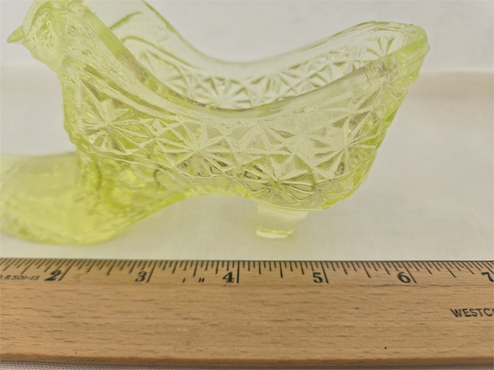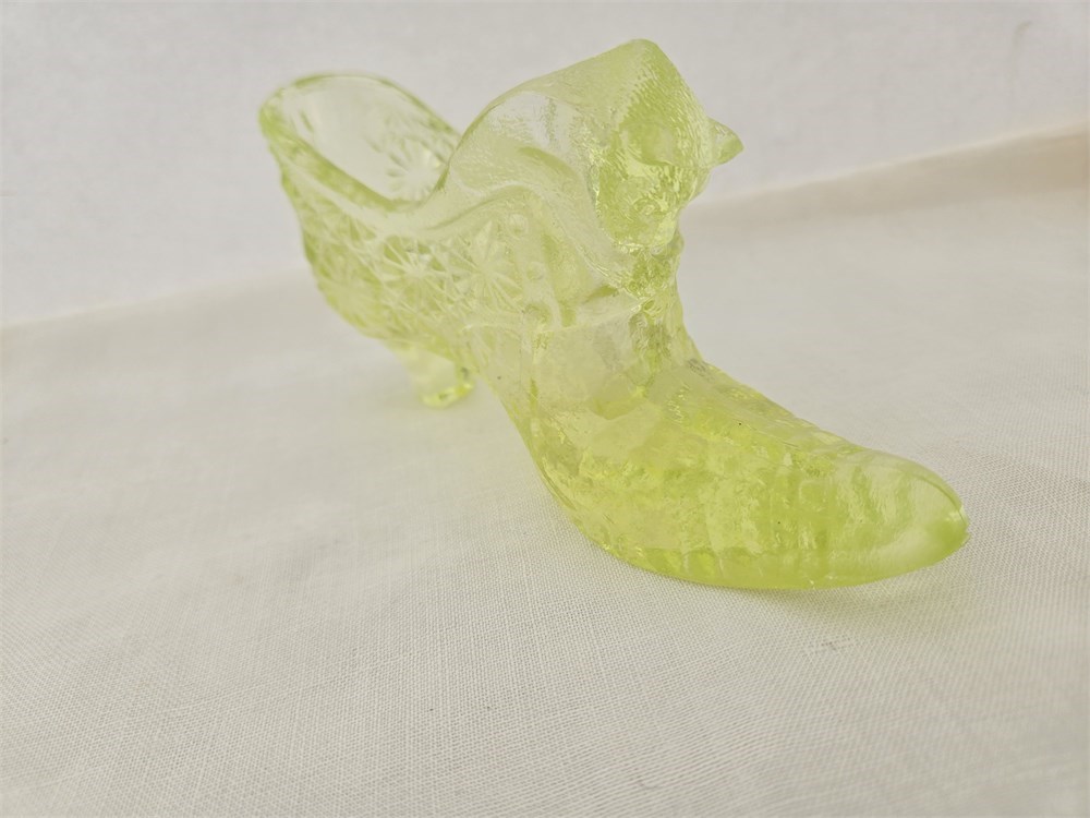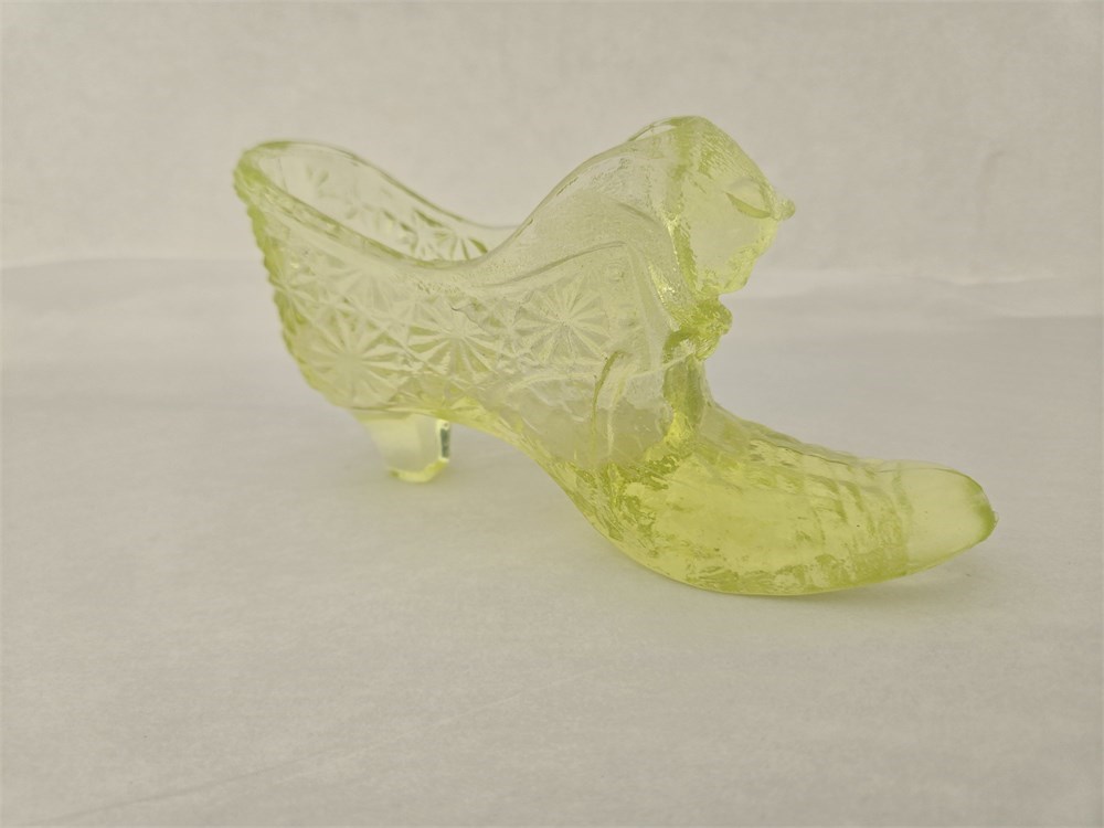 Vintage Boyd Uranium Vaseline Glass “Cat in Shoe” – Daisy & Button Pattern
