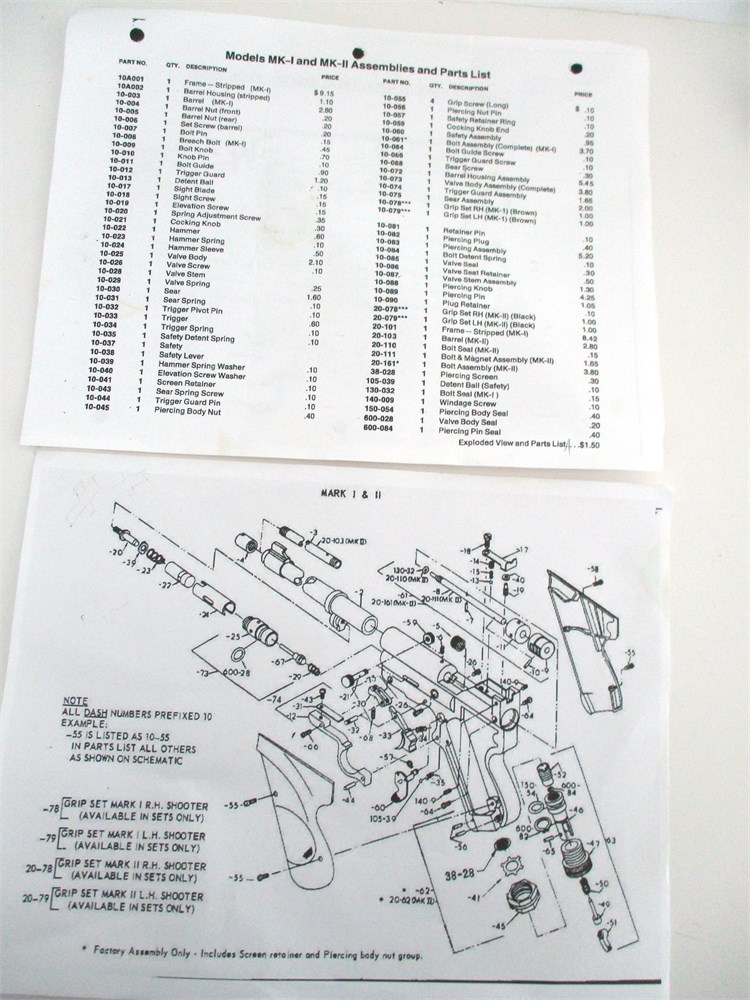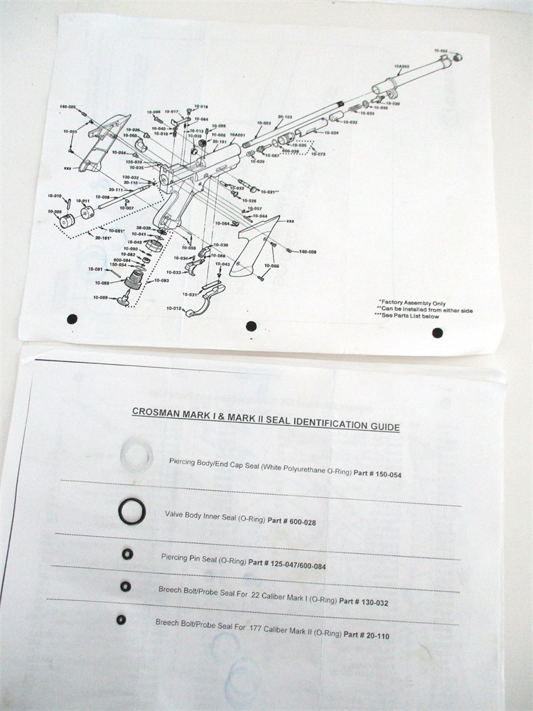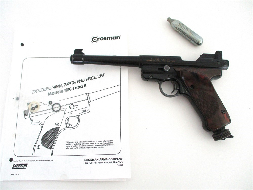 A Classic from the past, this Vintage Crosman CO2 Mark 1, 22 cal. Target Pistol 5 This comes from a single owner who purchase it in the 1970's in Phoenix, AZ.  It is in great condition, fully functional but does not hold CO2 pressure.  It comes with repair kit ORings and also parts list and schematics.