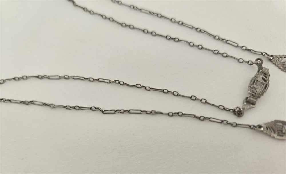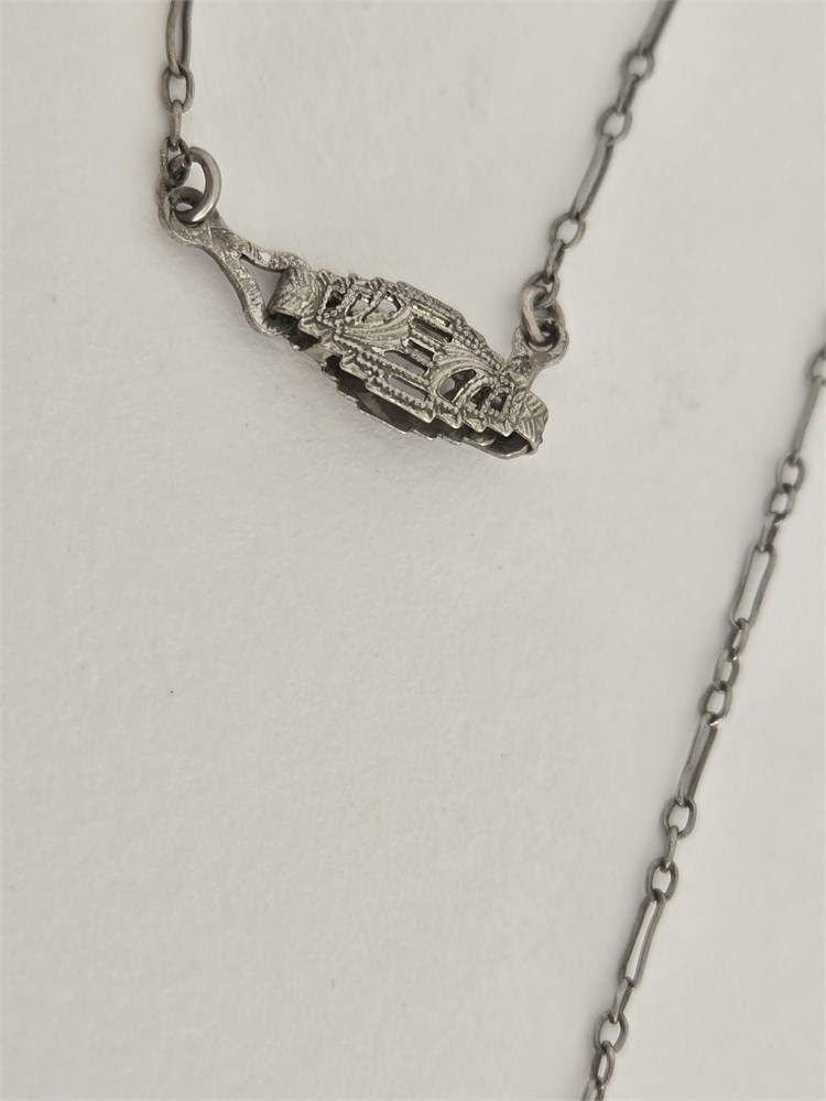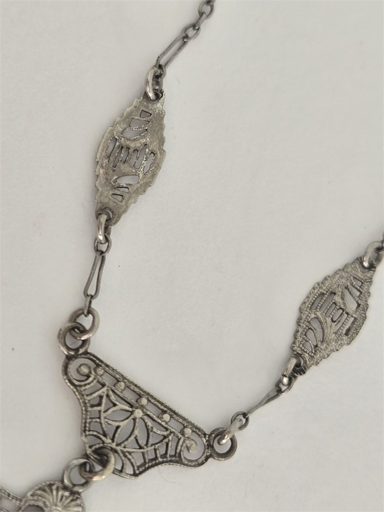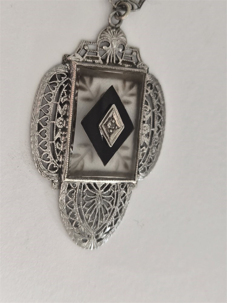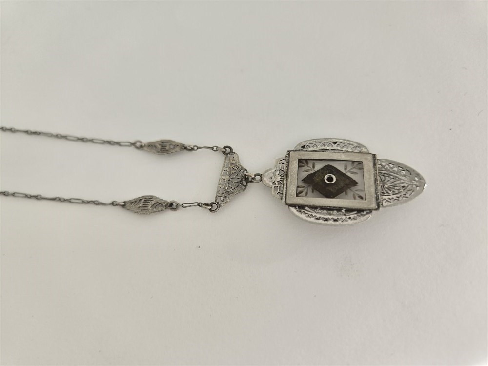 The pendant is suspended from its original filigree link chain, with three decorative panels and fine paperclip links, all in rhodium-plated pot metal (common in the period’s fine costume jewelry).
