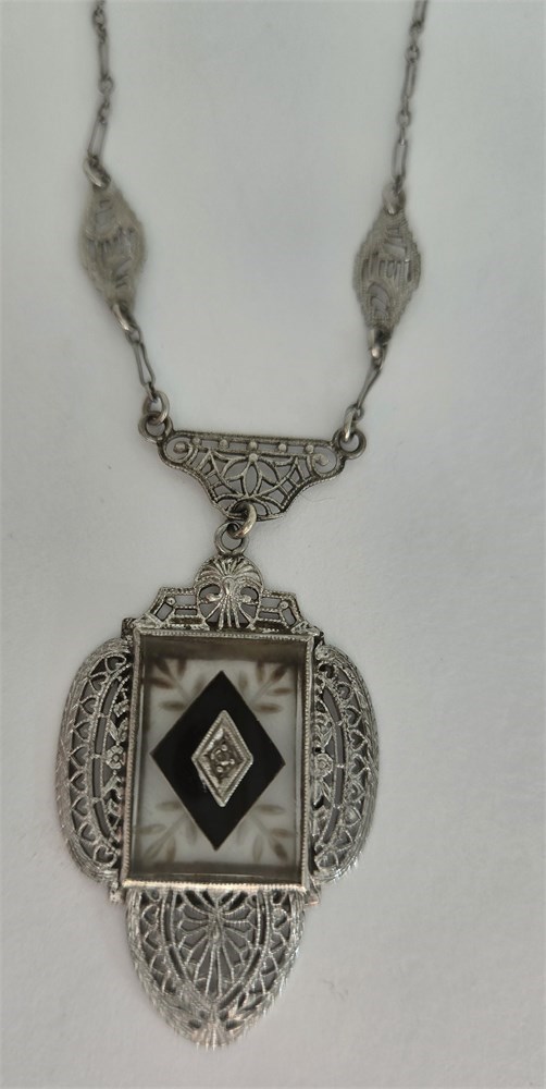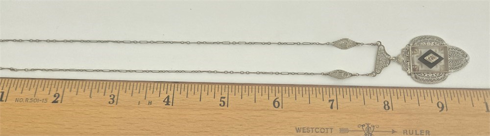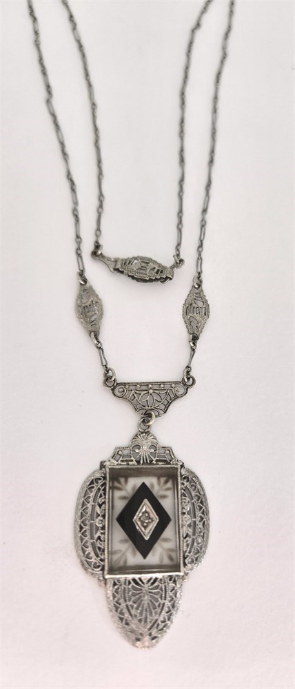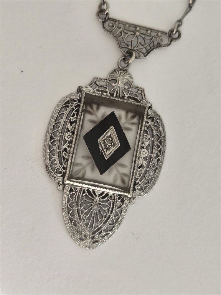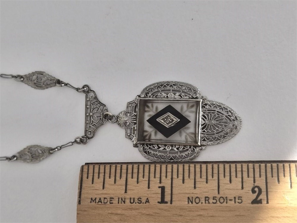 A striking Art Deco necklace featuring an ornate openwork filigree pendant set with a camphor glass panel overlaid with a black onyx glass diamond, centered with a tiny paste (rhinestone or diamond chip) accent. The detailed geometric filigree mount displays fine milgrain edging and delicate pierced scrollwork, typical of 1920s design.