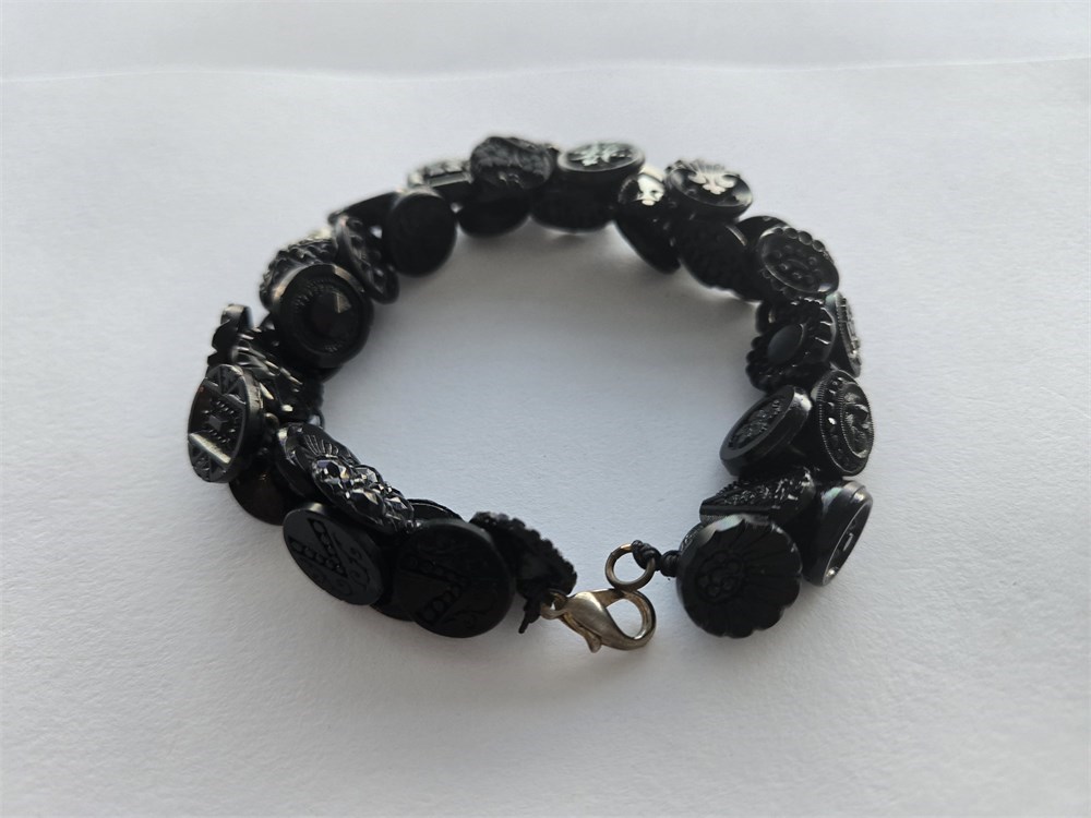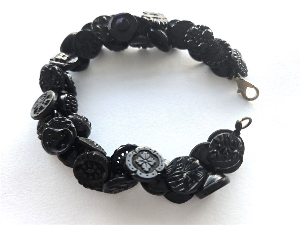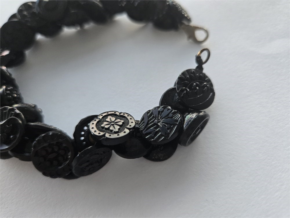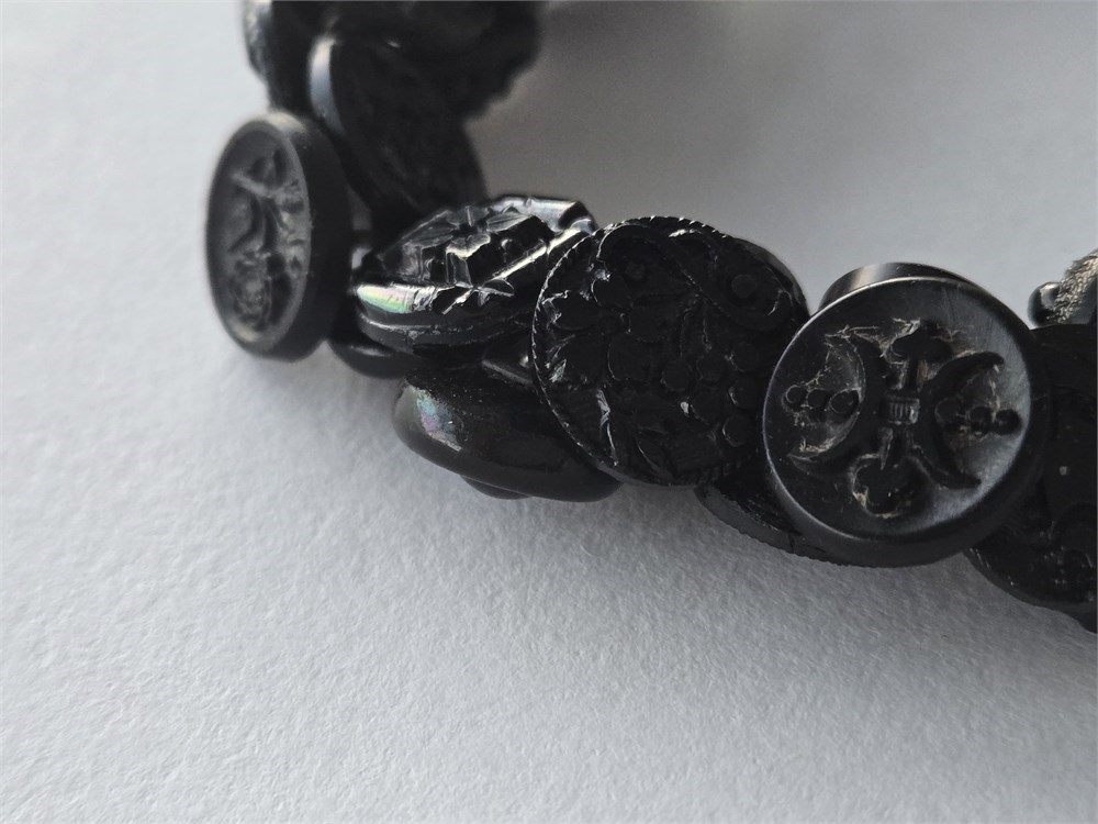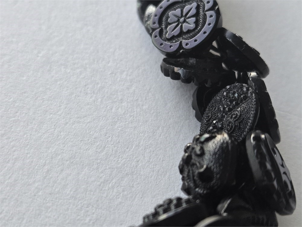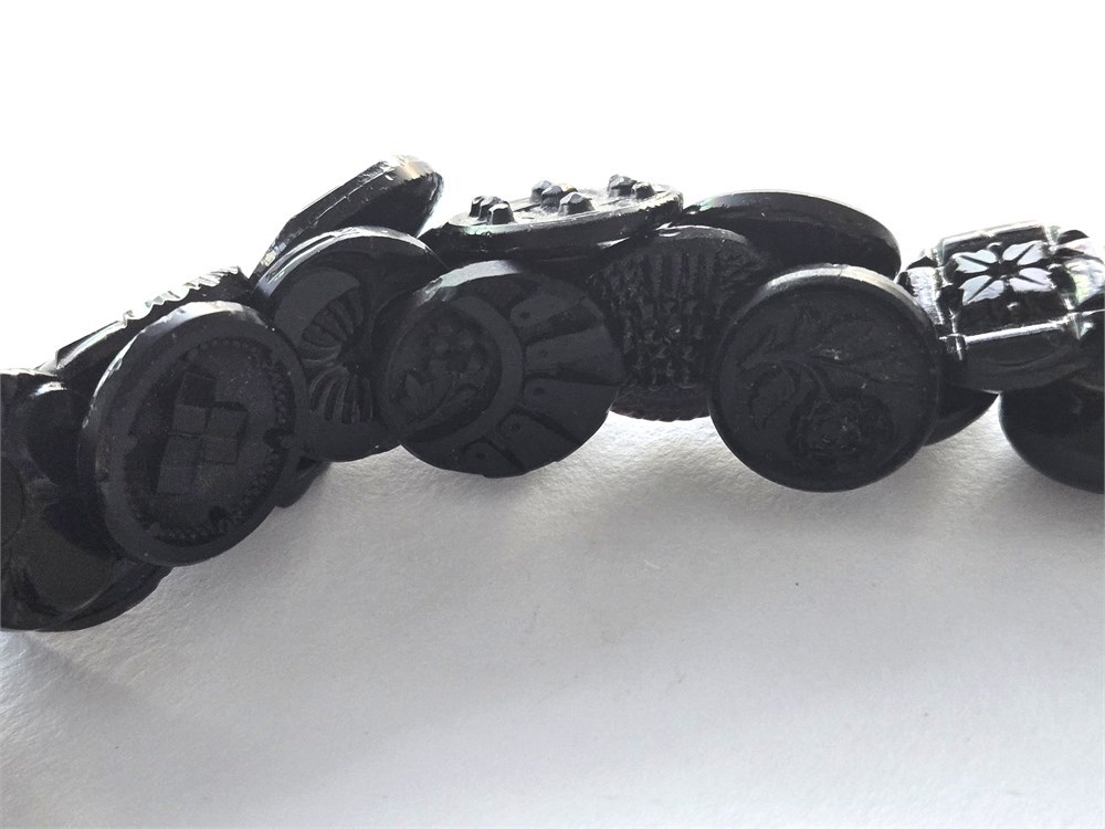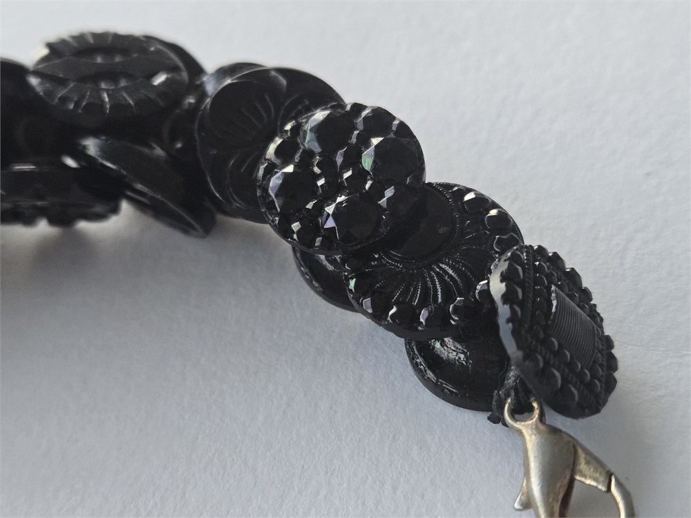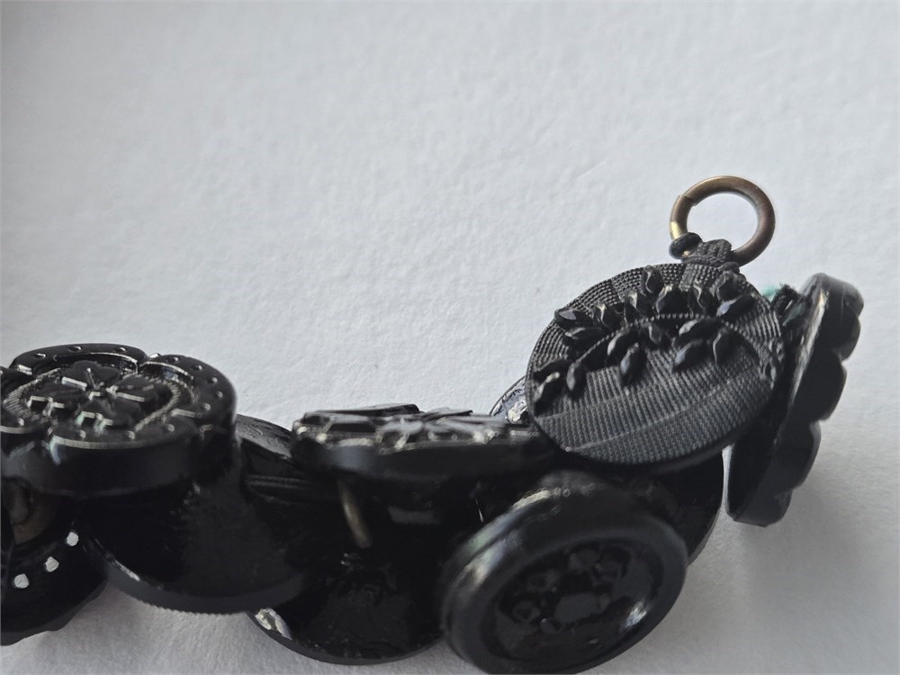 Lovely Victorian black glass charm string bracelet made from an assortment of 19th-century molded glass and jet-style buttons. Each button features a unique raised, etched, or lustered design—floral, geometric, and symbolic patterns typical of late 1800s mourning fashion.
