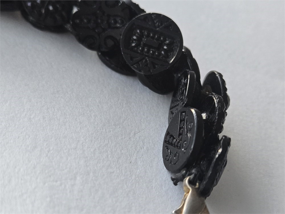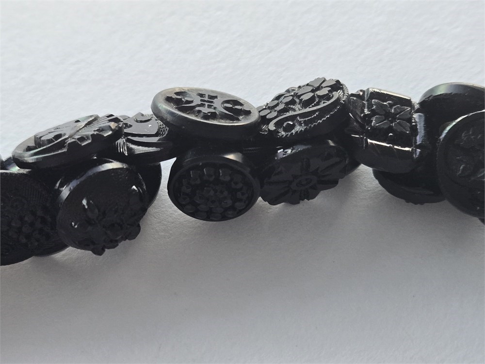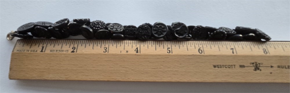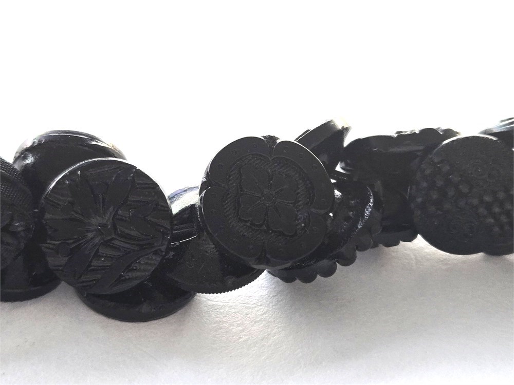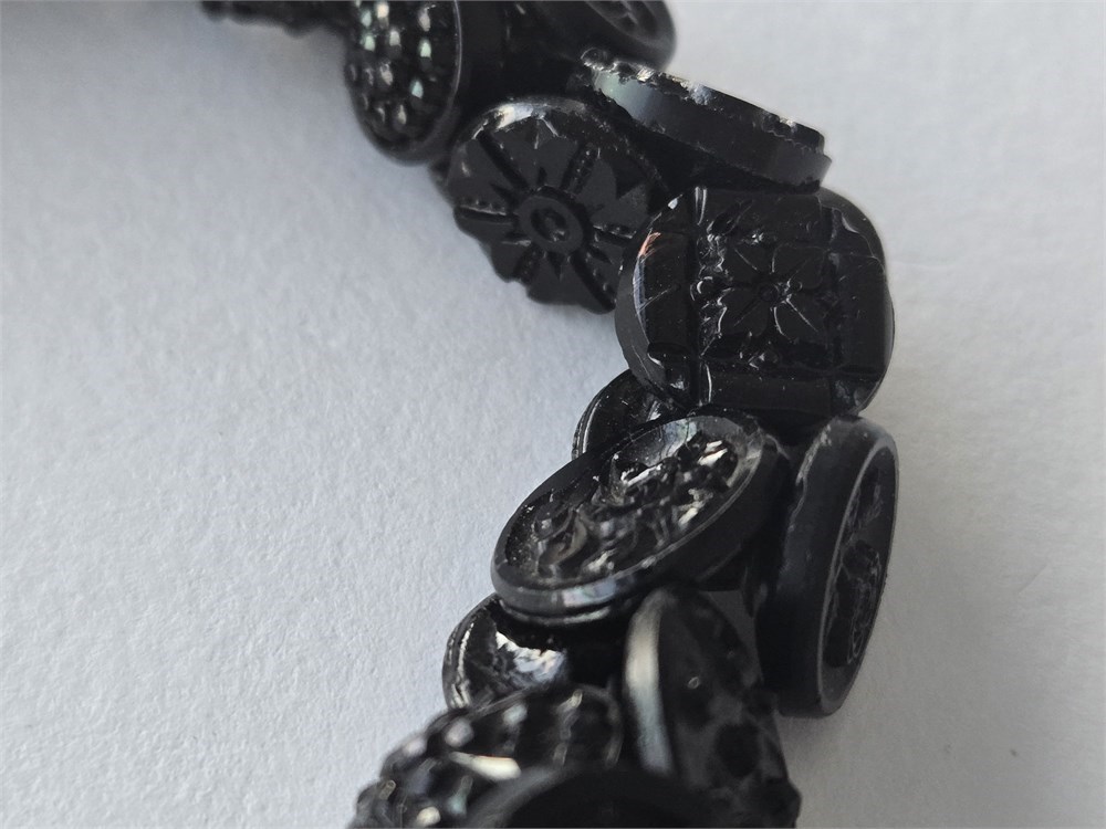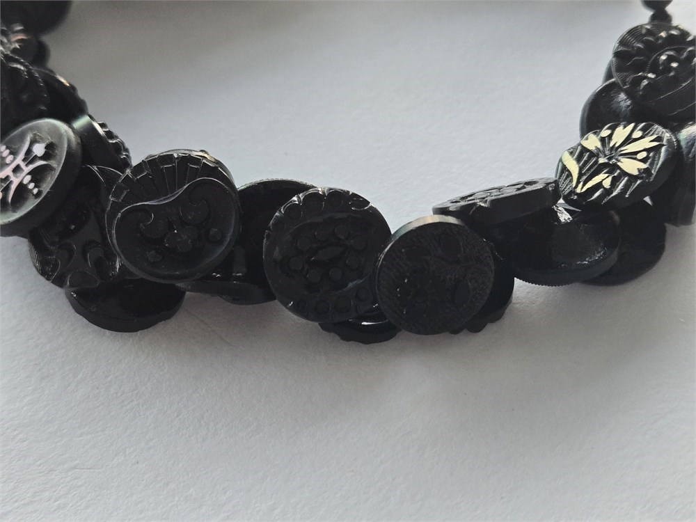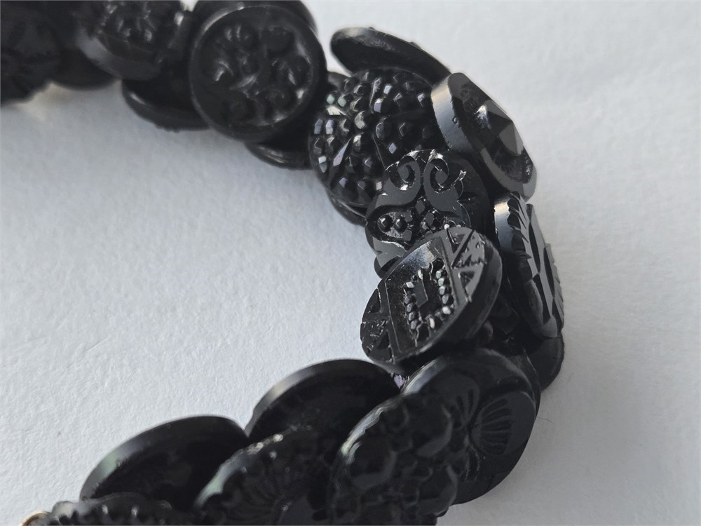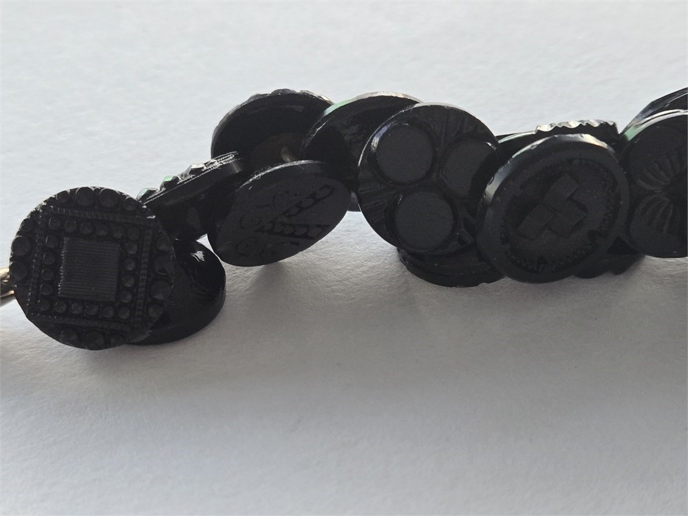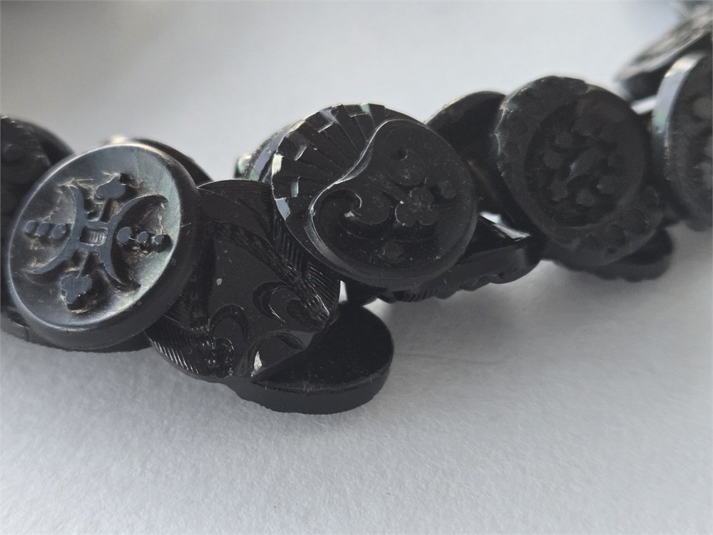 Lovely Victorian black glass charm string bracelet made from an assortment of 19th-century molded glass and jet-style buttons. Each button features a unique raised, etched, or lustered design—floral, geometric, and symbolic patterns typical of late 1800s mourning fashion.