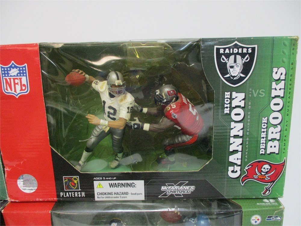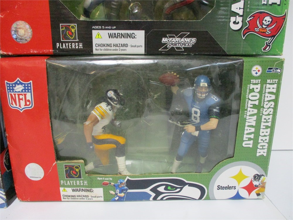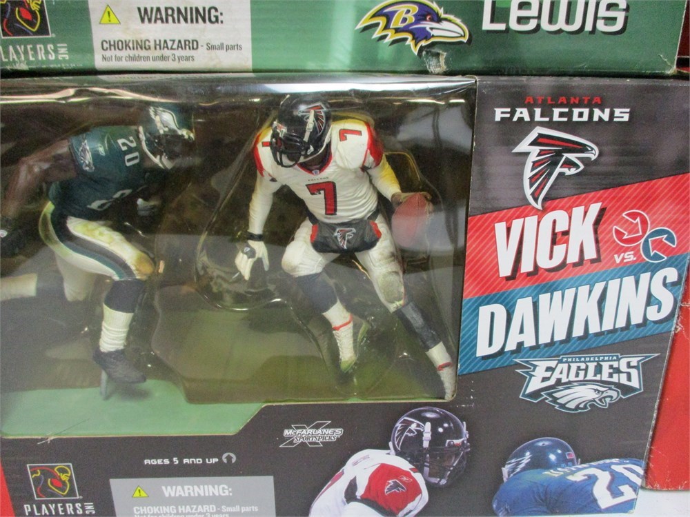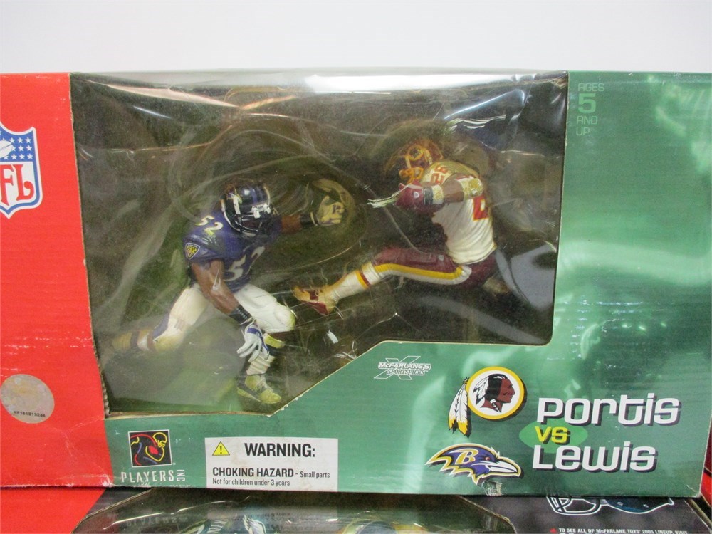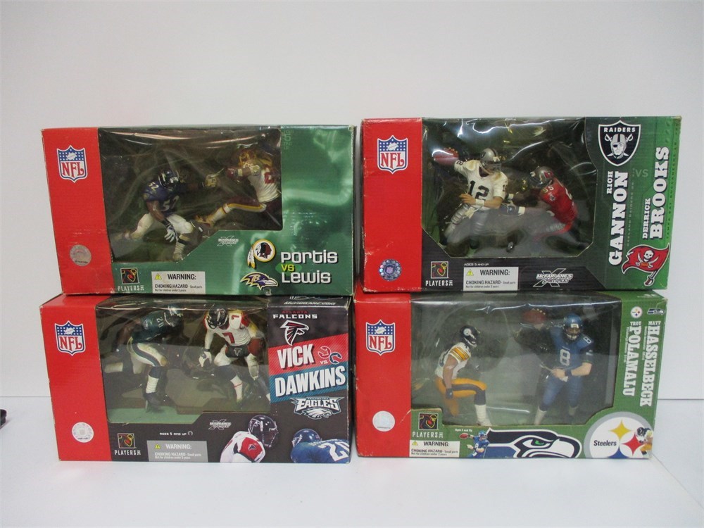 A 4 Box Lot of NFL Sports Action Figures, Portis vs Lewis, Vick vs Dawkins, Cannon vs Brooks and Hasselbeck vs Polamalu.  All in good vintage condition, some discoloration to the plastic.