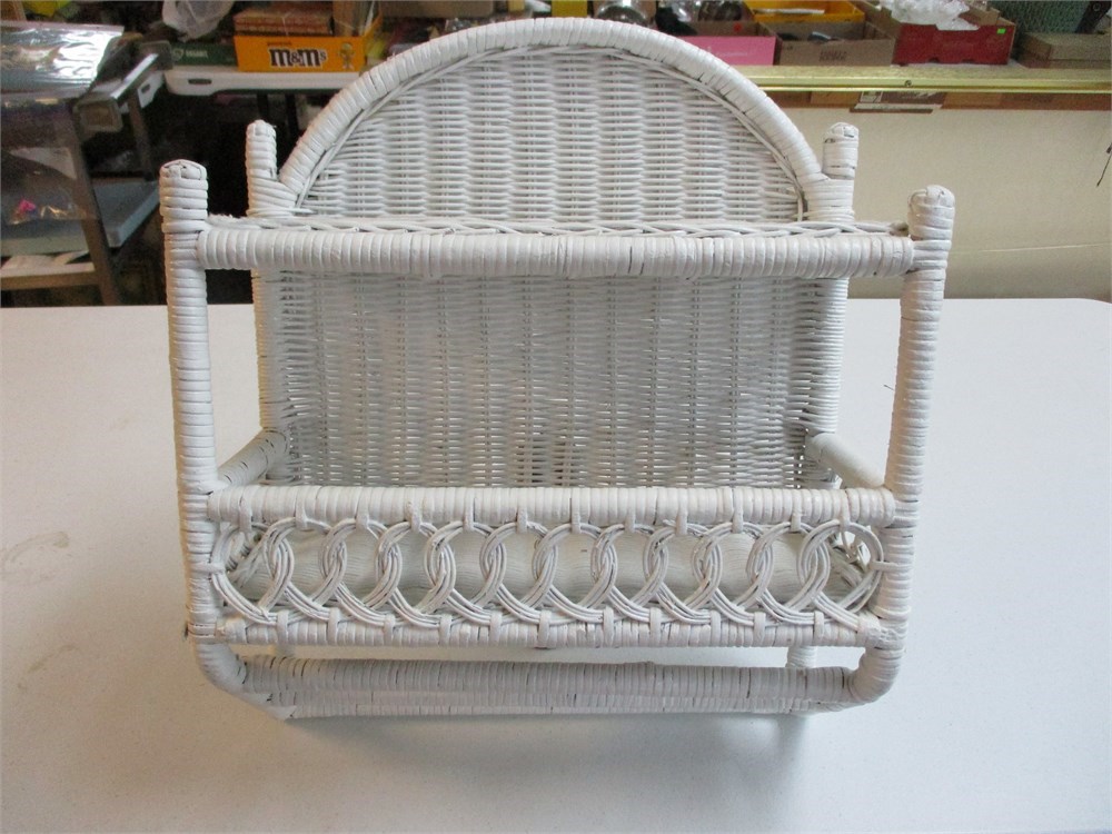 A vintage 2 piece lot of painted white wicker.  The plant stand is very unique with its curved legs, gives nice dimension to the piece.  The paint is flaking but very shabby sheik. The stand measures 71" tall x 15" at its widest.   The white wicker wall shelf is in very nice vintage condition and measures 15" tall x 15" wide.