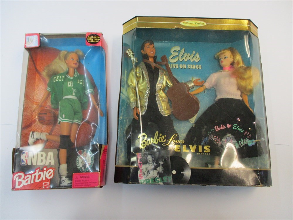 This Lot consists of Barbie Loves Elvis and NBA Celtic Barbie.  All in good vintage condition, some discoloration to the plastic and boxes.
