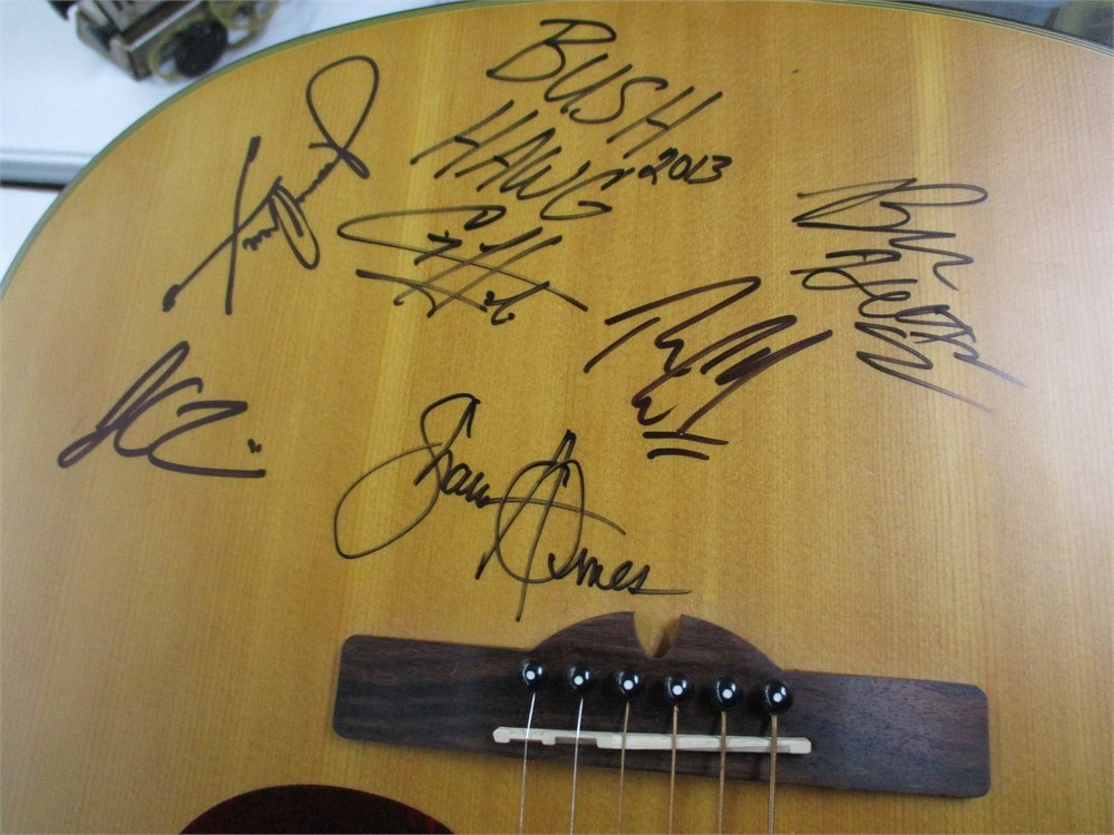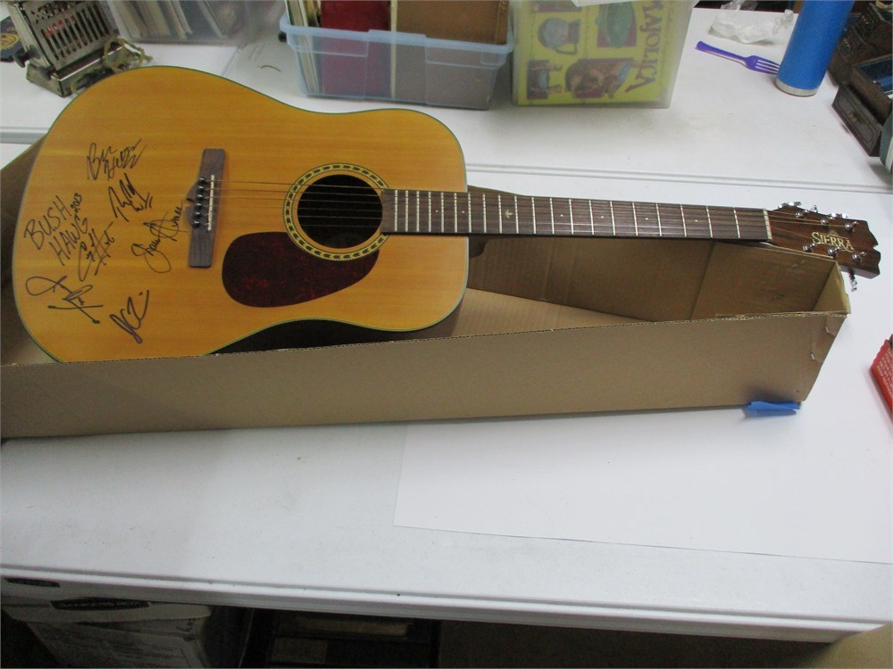 This great Sierra Guitar was signed by the band members of the Country/Southern rock band, "Bush Hawg" on their 2013 tour.  Signed "Bush Hawg" instrument are quite rare but the bank never reached major national fame, so value is largely collector or fan driven.  The piece is in wonderful condition !