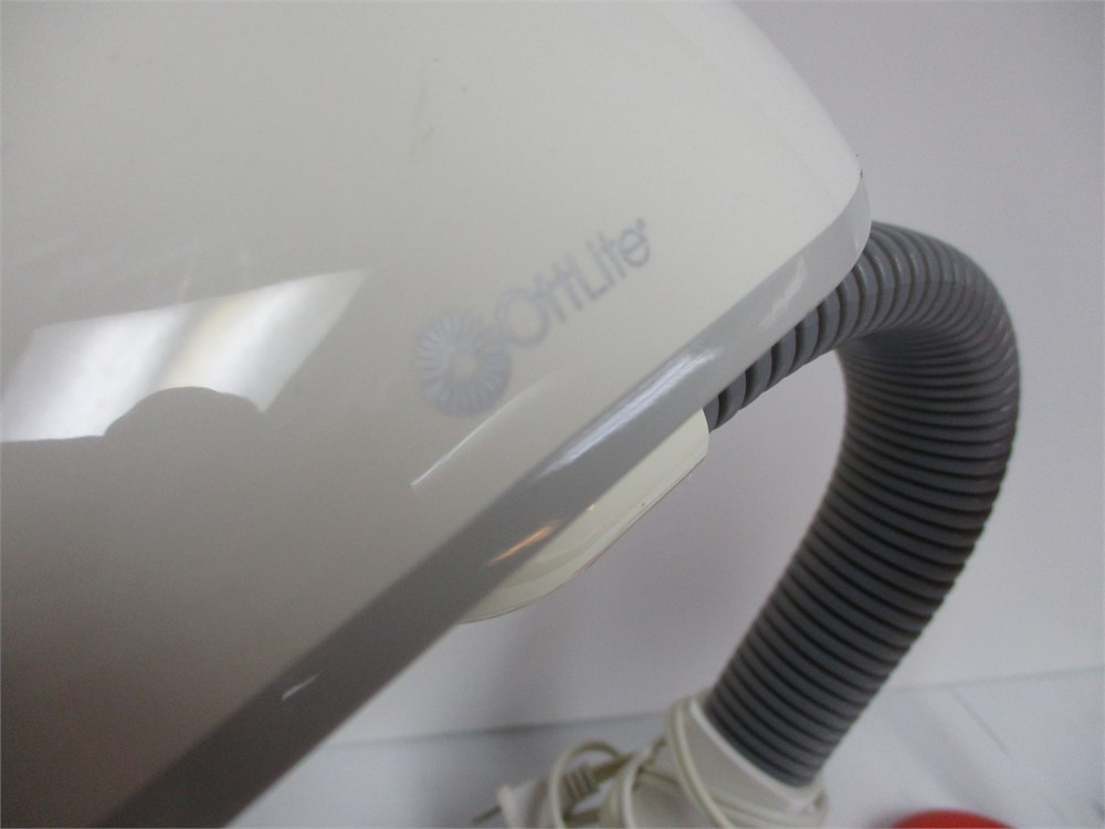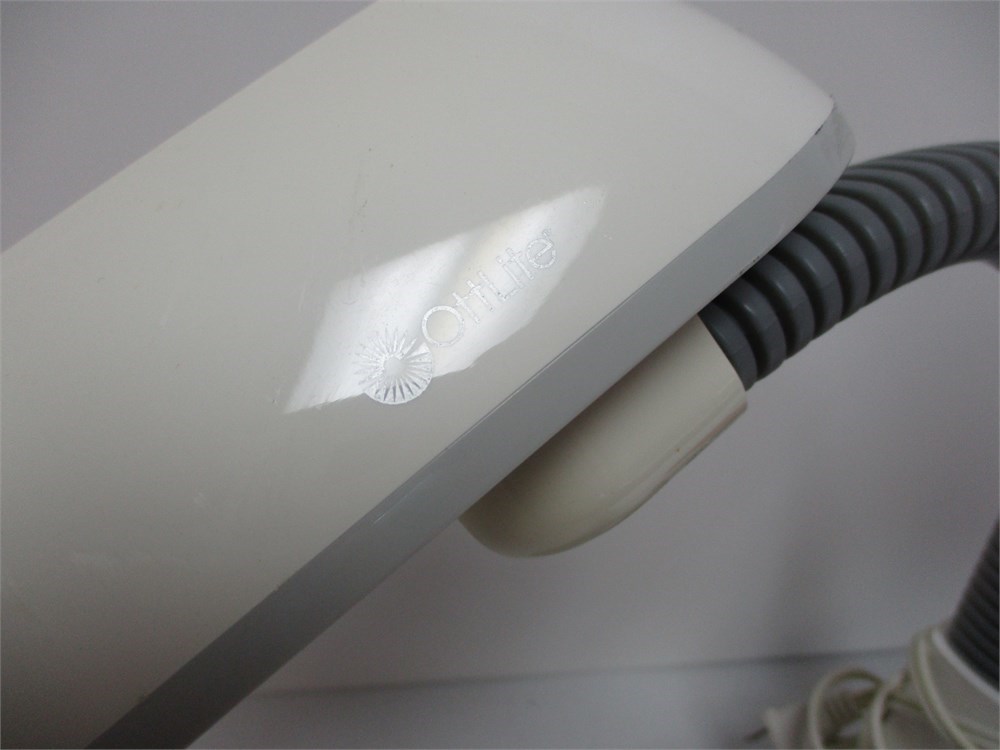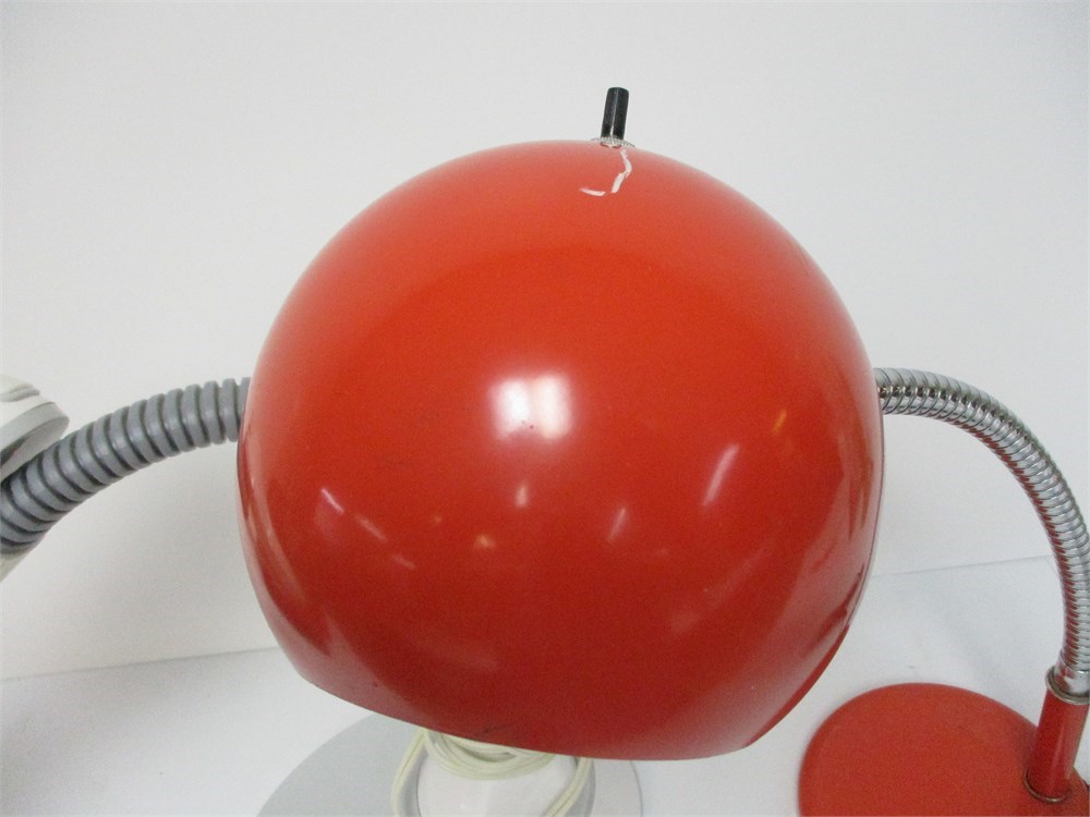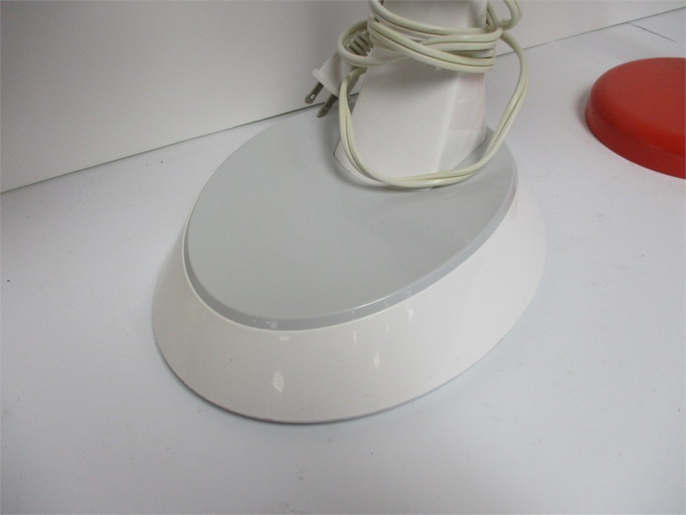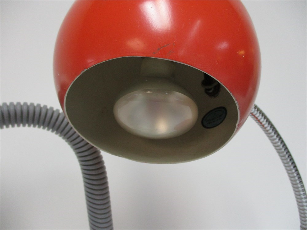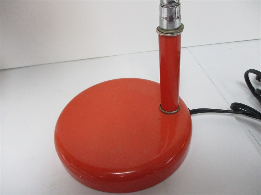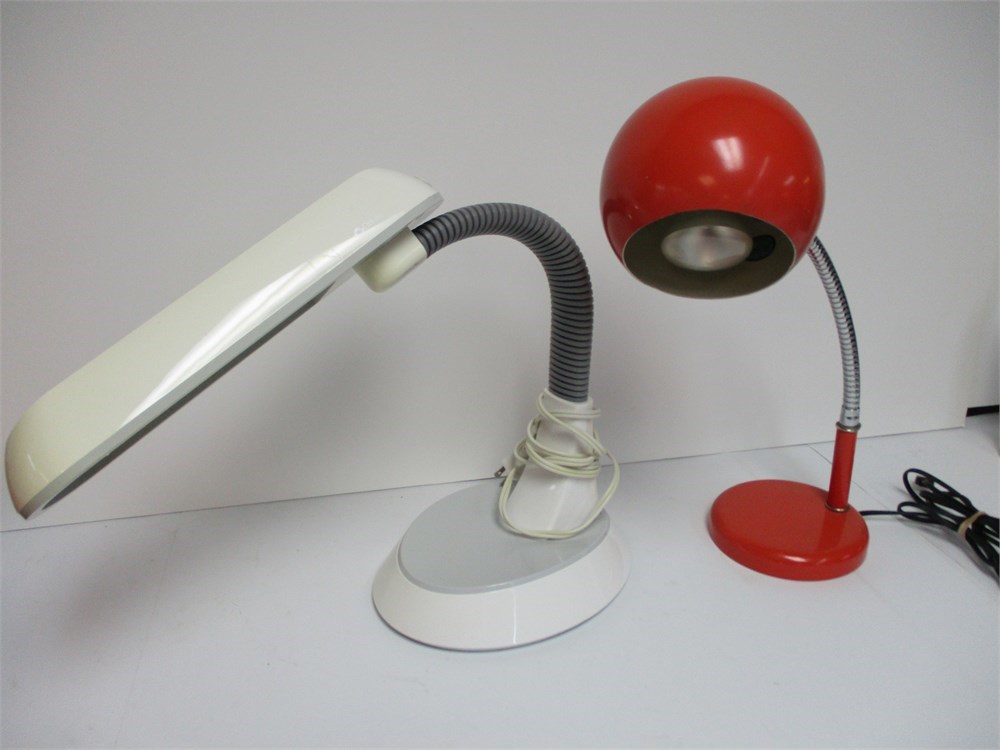 This lot consists of a orange MCM goose neck lamp and a newer, white goose neck sewing lamp.  Both are in very nice vintage condition and working.  The sewing lamp bulb is a little dim just might need to be replaced. The orange MCM is 17" tall.