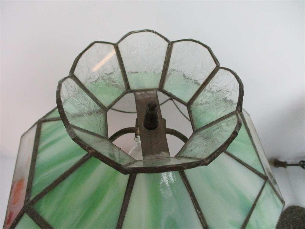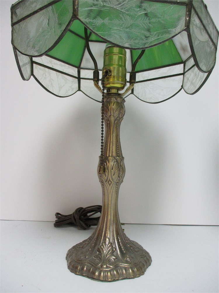 This is a lovely pair of vintage, clear etched glass and green slag glass small dresser lamps, with finials. They are in lovely condition, very nice detail and color.  They each measure 17" tall.