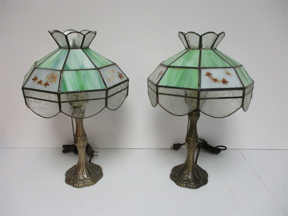 Pair of Clear Etched, Green Slag Glass, Small Dresser Lamps