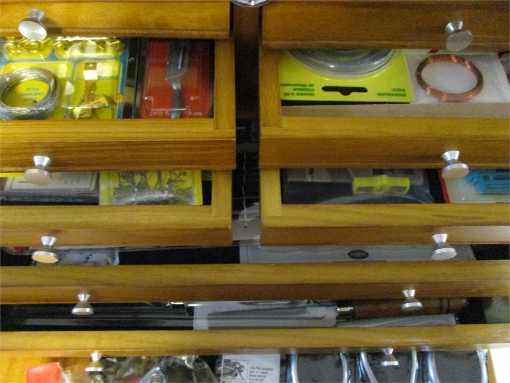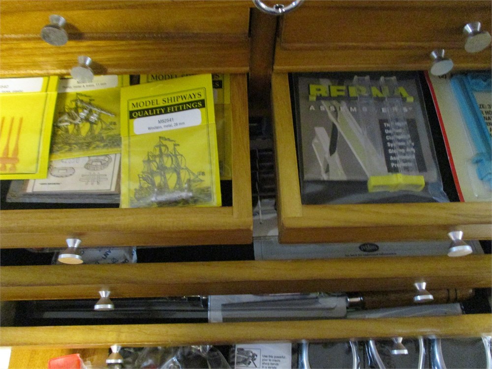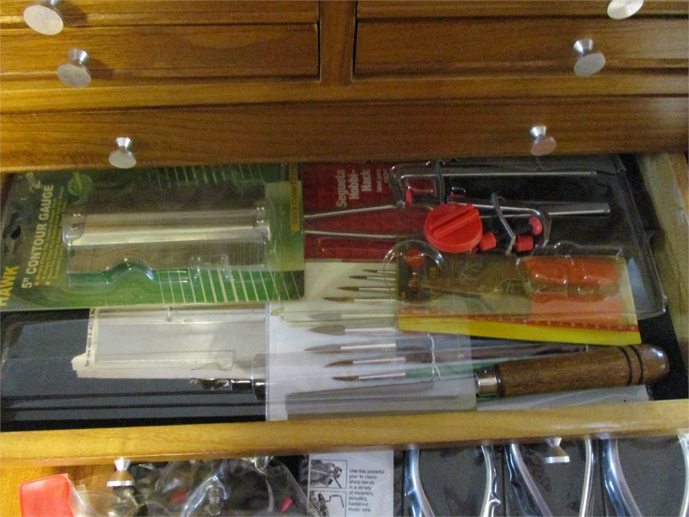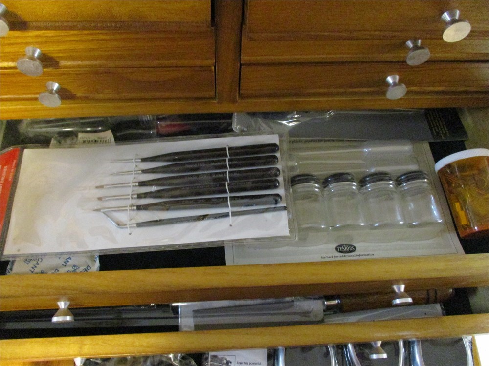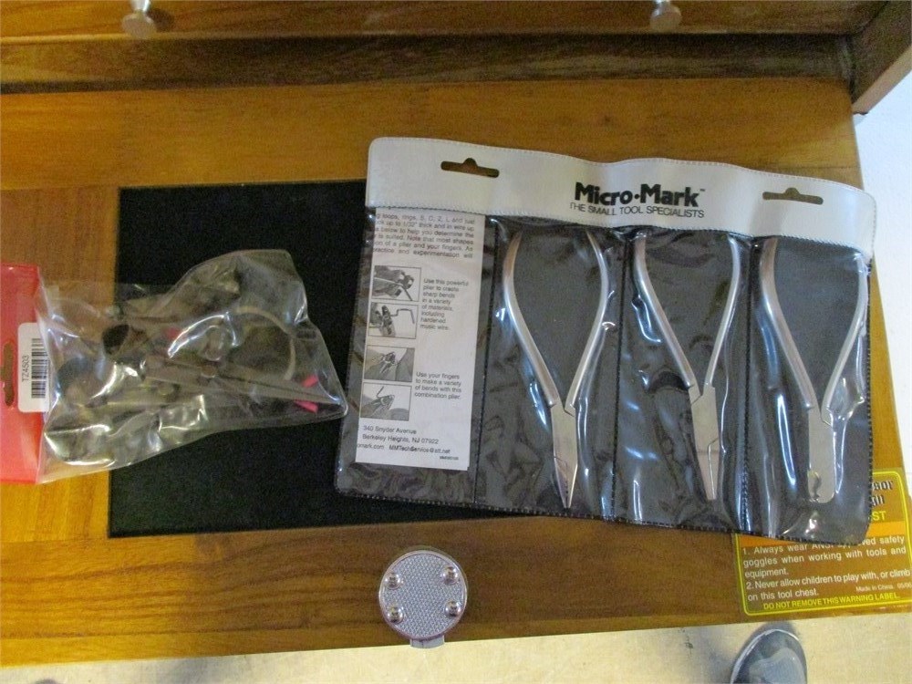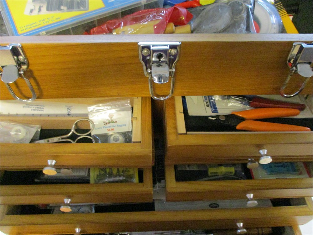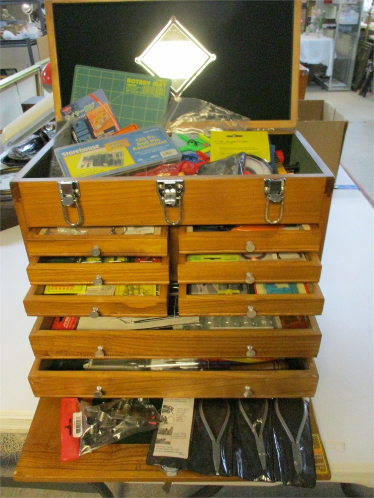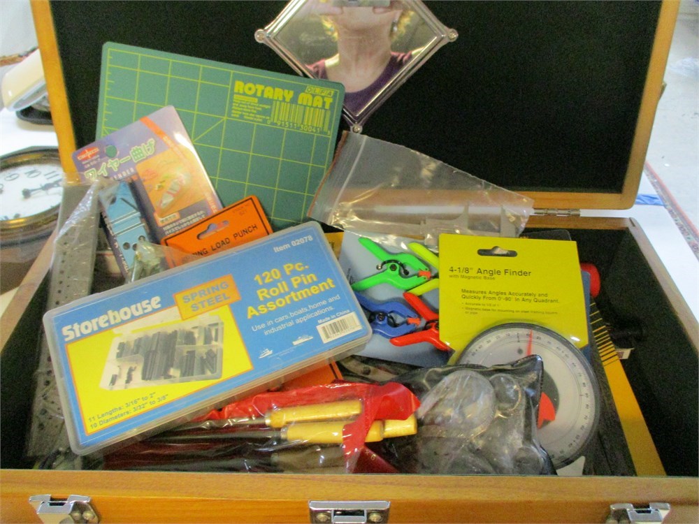 A wonderful Locking Modern Machinest Tool Box w/ Key,  Full of GREAT STUFF !  This came from an estate where the owner painted, made model ships and trains, so there are alot of measuring devices, some still in original packaging, parts, findings, planes, cutting tools, paint brushes, calipers....just to name a few !  This is a great piece !