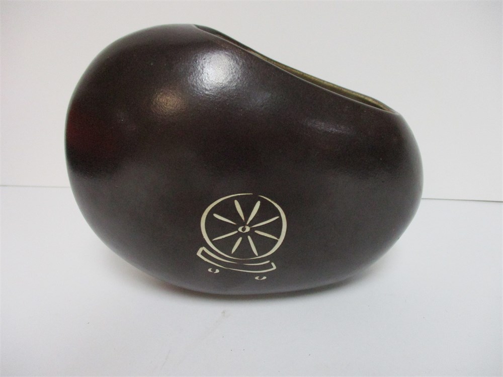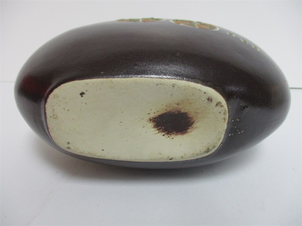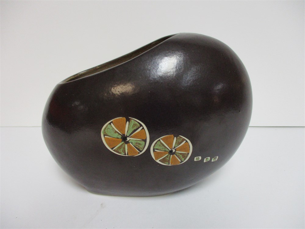 A wonderful vintage, MCM Pottery Vase, possibly from West Germany.  It has a nice asymmetrical design, lovely colors, design and patina. Unsigned.  Measures 8 x 6".