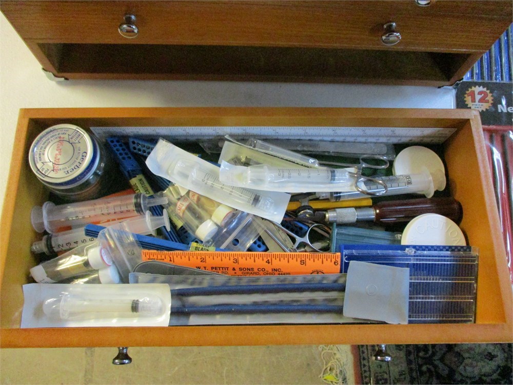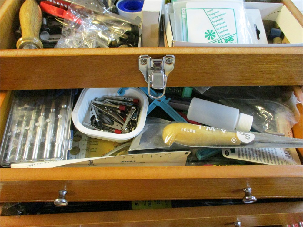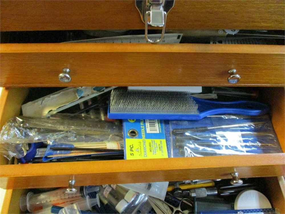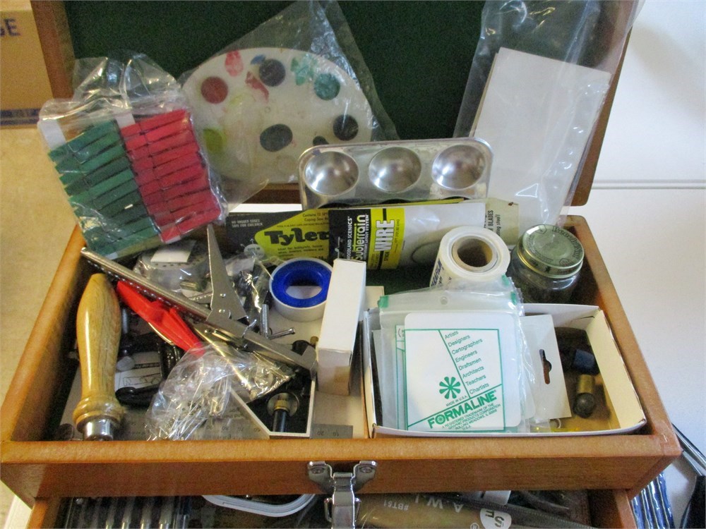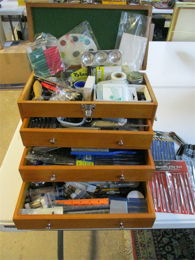 A wonderful Modern Hobbyist Tool Box,  Full of GREAT STUFF !  This came from an estate where the owner painted, made model ships and trains, so there are alot of measuring devices, some still in original packaging, parts, findings, planes, cutting tools, paint brushes, calipers....just to name a few !  This is a great piece !  It measures 16" wide x 11" tall x 8" deep.