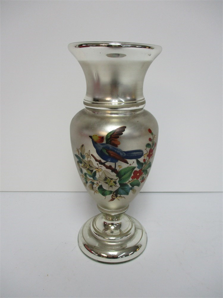 This is a beautiful Antique, Bohemia or Czech, Hand-painted Mercury Glass vase circa 1880's -1900.  It has a lovely hand-painted bird in the center.  It stands 9" tall and is in beautiful condition.