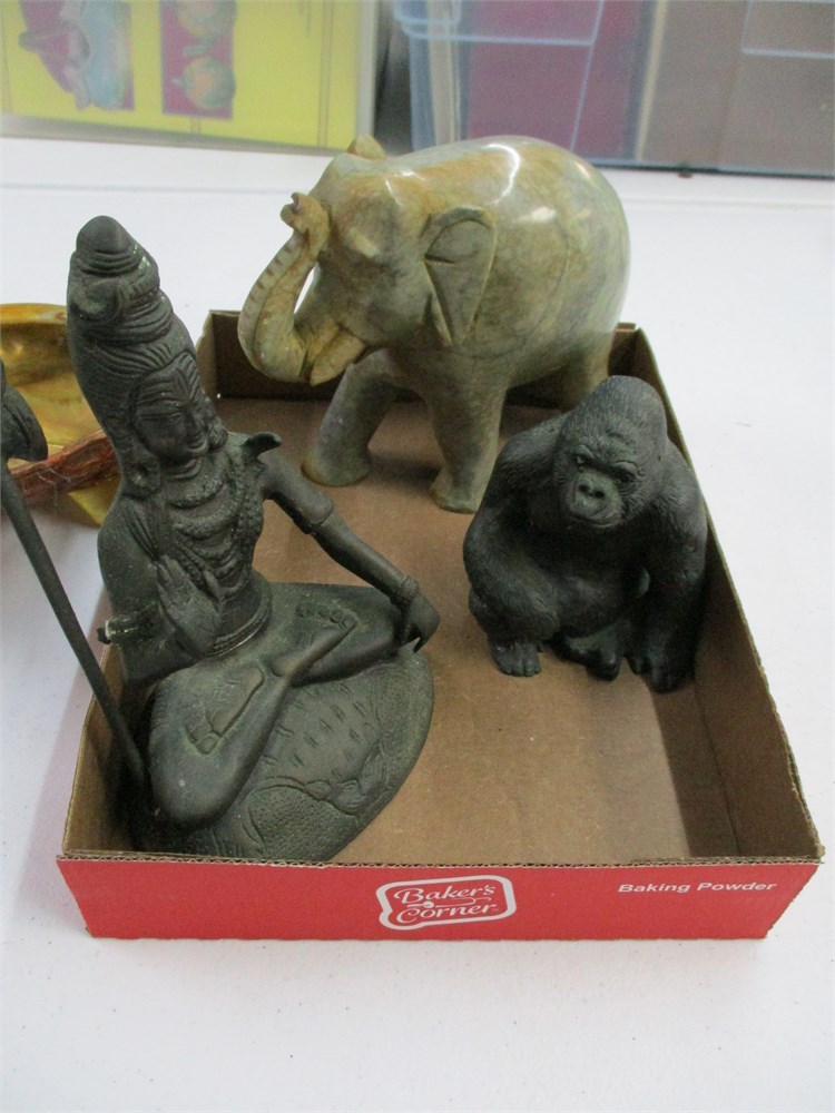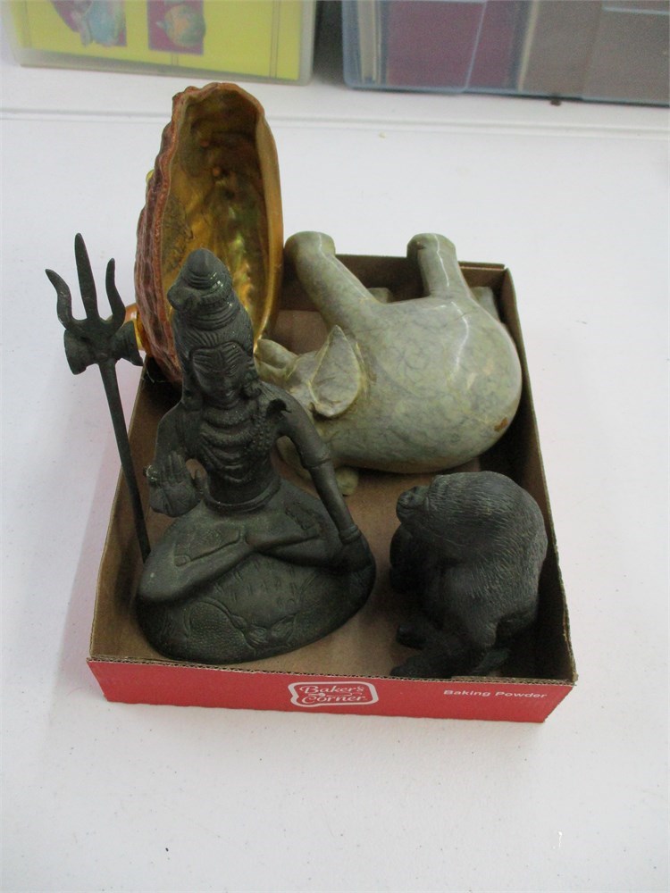 This is a vintage lot consisting of heavy carved Onyx Elephant, Gorilla statue, seated Buddha and footed Abalone Shell dish. All in vintage condition with normal age related wear.