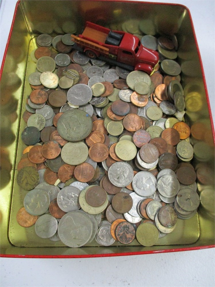 This is a box lot of coins with different denominations.  Possibly some silver.  This lot is uncounted.  It also has a little plastic fire truck as a bonus!