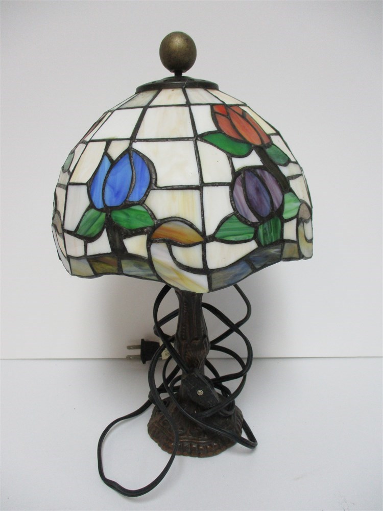 This is a very cute and small Tiffany Style Table Lamp. It stands 12" tall including finial. It appears that the finial might not be original to the piece. The floral shade is in nice condition and the cord has an in-line switch.