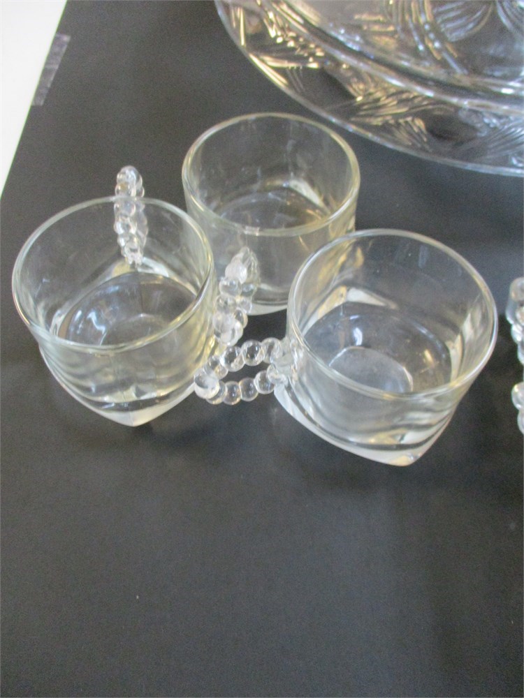 This vintage lot consists of 4, Hazel-Atlas Snack Set or "Luncheon Set" and this particular design is called the "Ball & Rib".  They are partitioned trays with a matching cup.  Also, a large Cake Plate w/ Dome. All pieces in very nice vintage condition and ready for use.