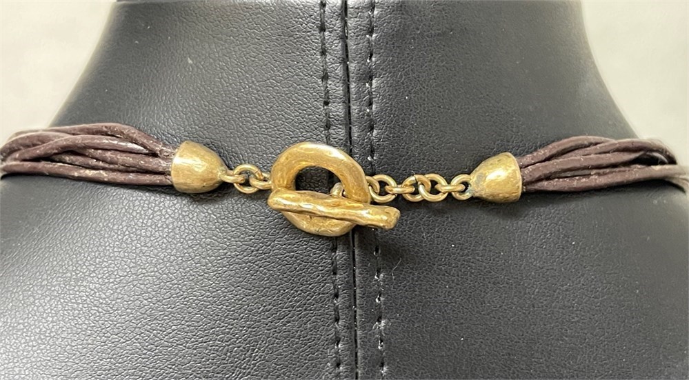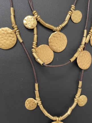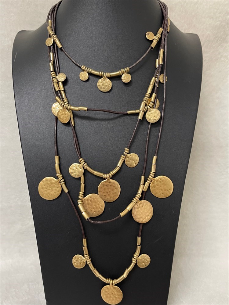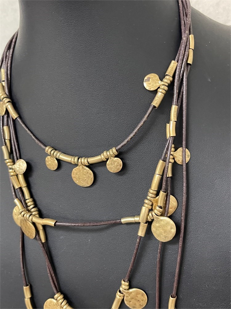 Stylish layered necklace by Chicos has 5 layers with copper colored beads and discs and gold tone beads and discs. The shortest layer measures approximately 16 inches with the longest at about 26 inches and a 4 inch extender. Please see the photos and ask any questions before bidding
