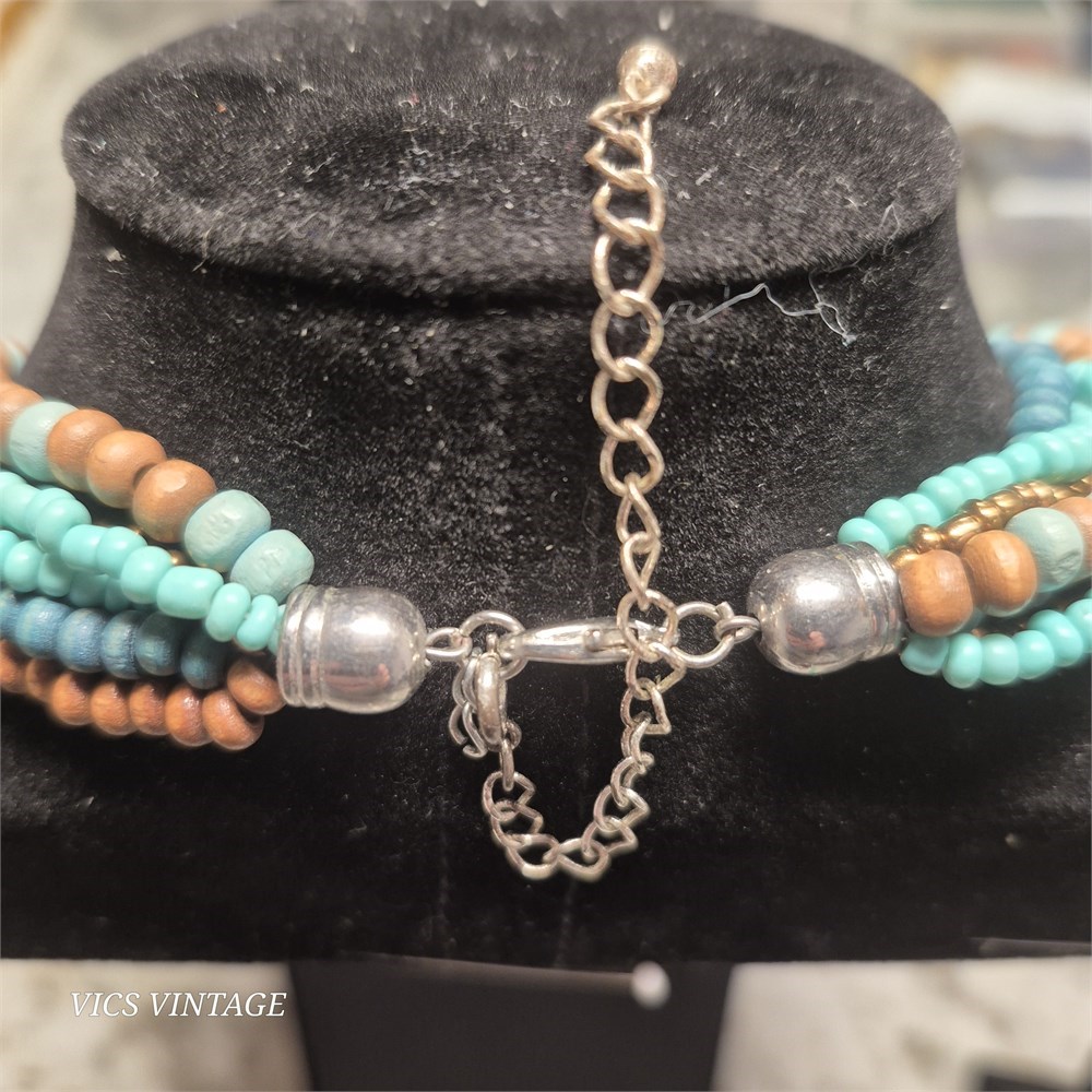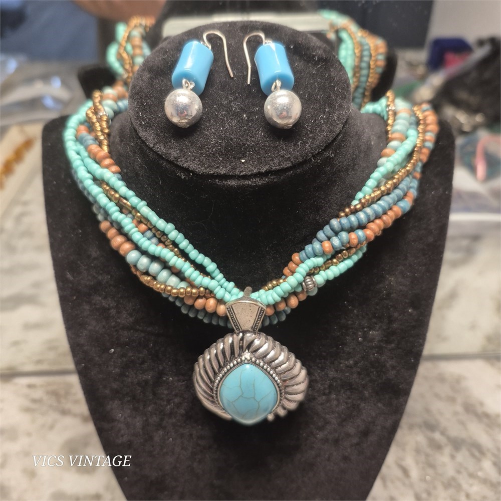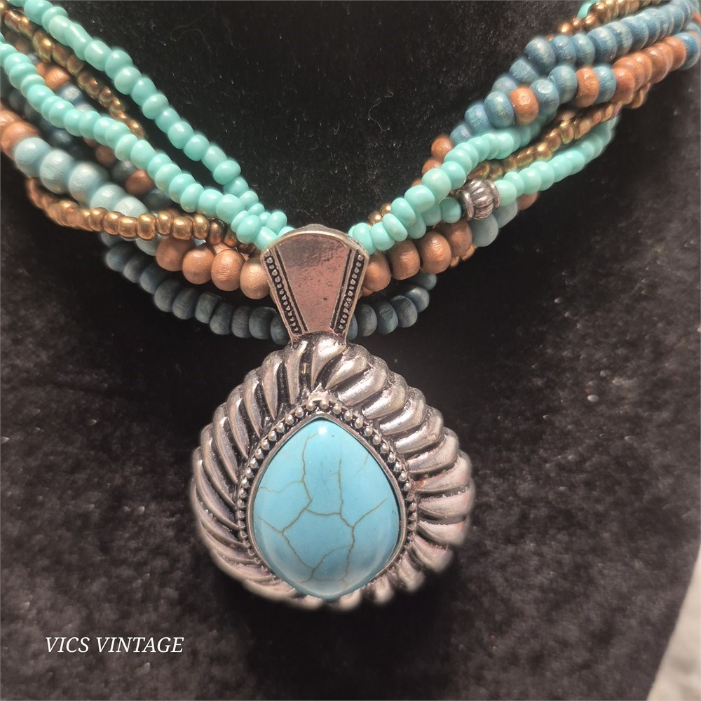 Art Deco Style Silver Tone Faux Turquoise Pendant Dangle Necklace Jewelry