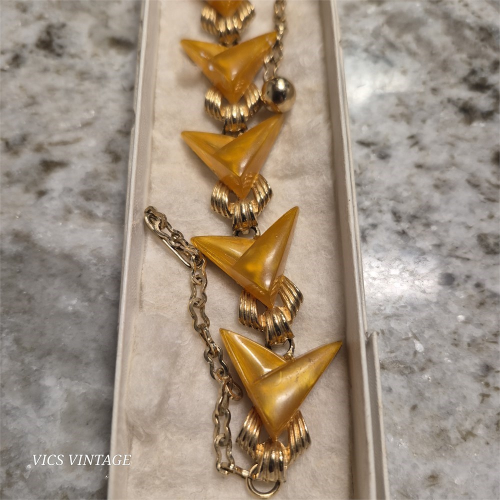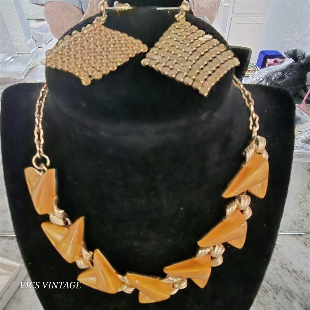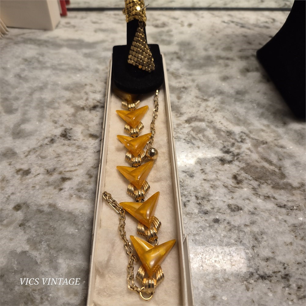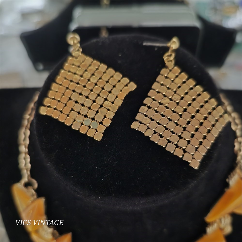Vintage Celluloid "V" shaped in Gold tone setting / Gold mesh Earrings