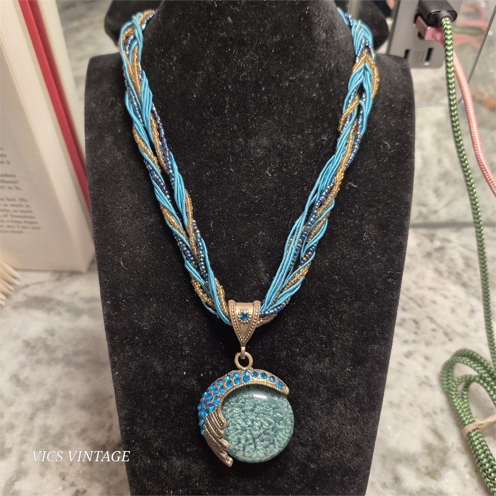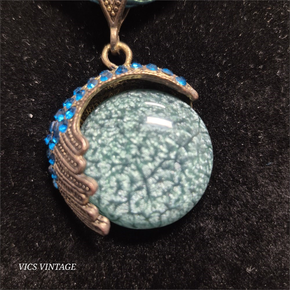Mystical Moon Bohemian Faux Opal Peacock Pendant Necklace w/Copper Earrings