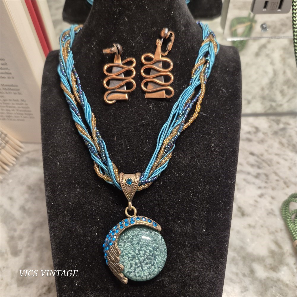 Mystical Moon Bohemian Faux Opal Peacock Pendant Copper Necklace w/Copper Earrings