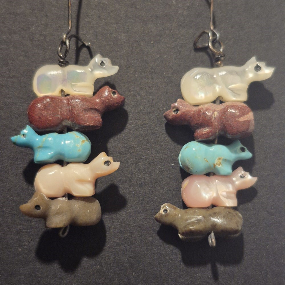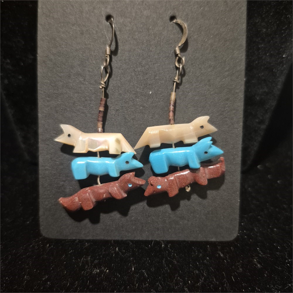 Vintage Sterling Silver Fetish Earrings Carved Turquoise & Shell Animal Fox!!!