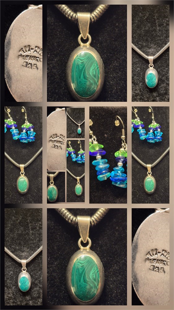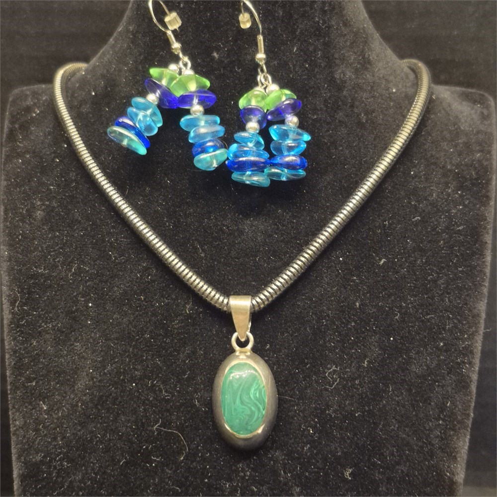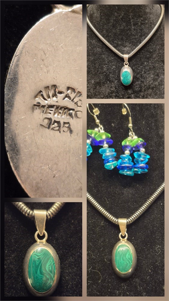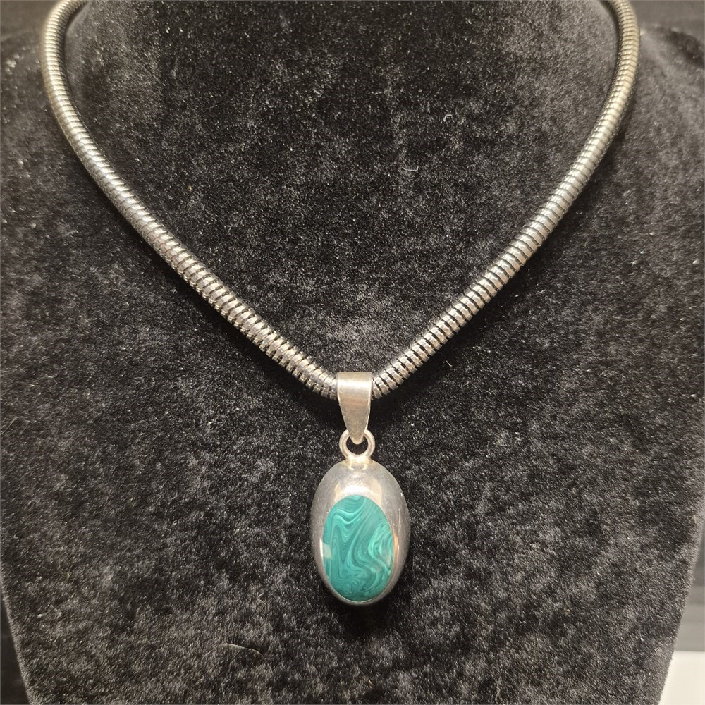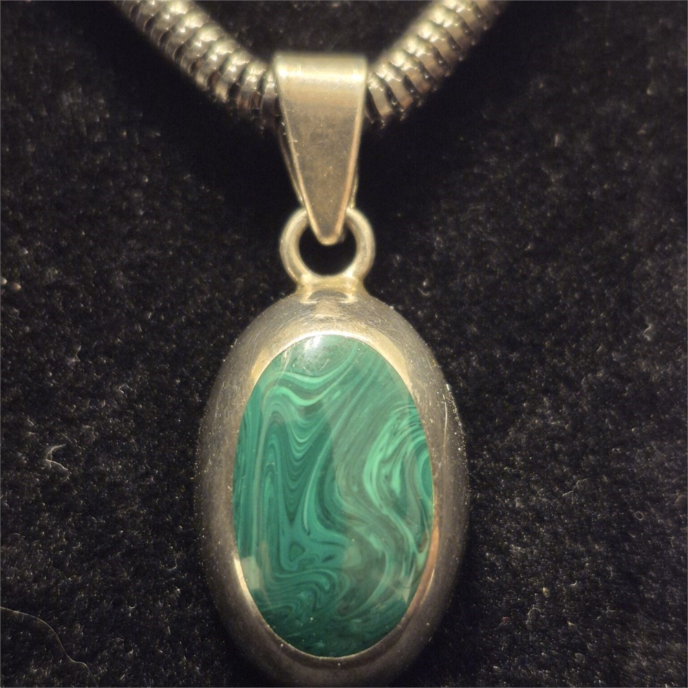 Sterling Silver Oval Malachite Cabochon Gemstone Signed Pendant Necklace