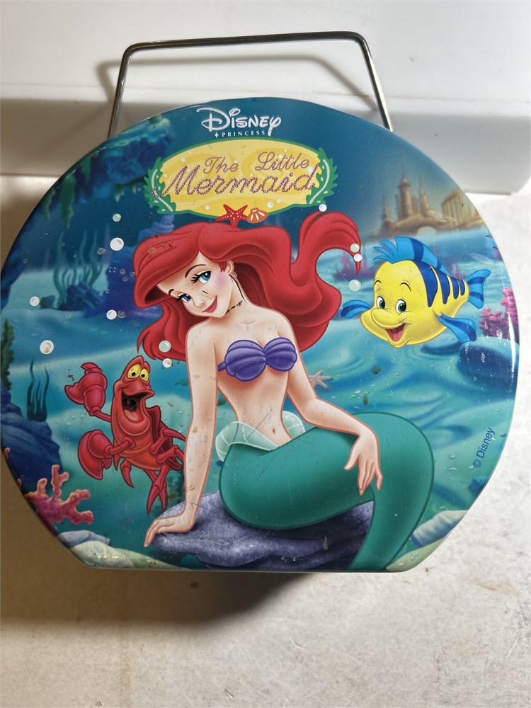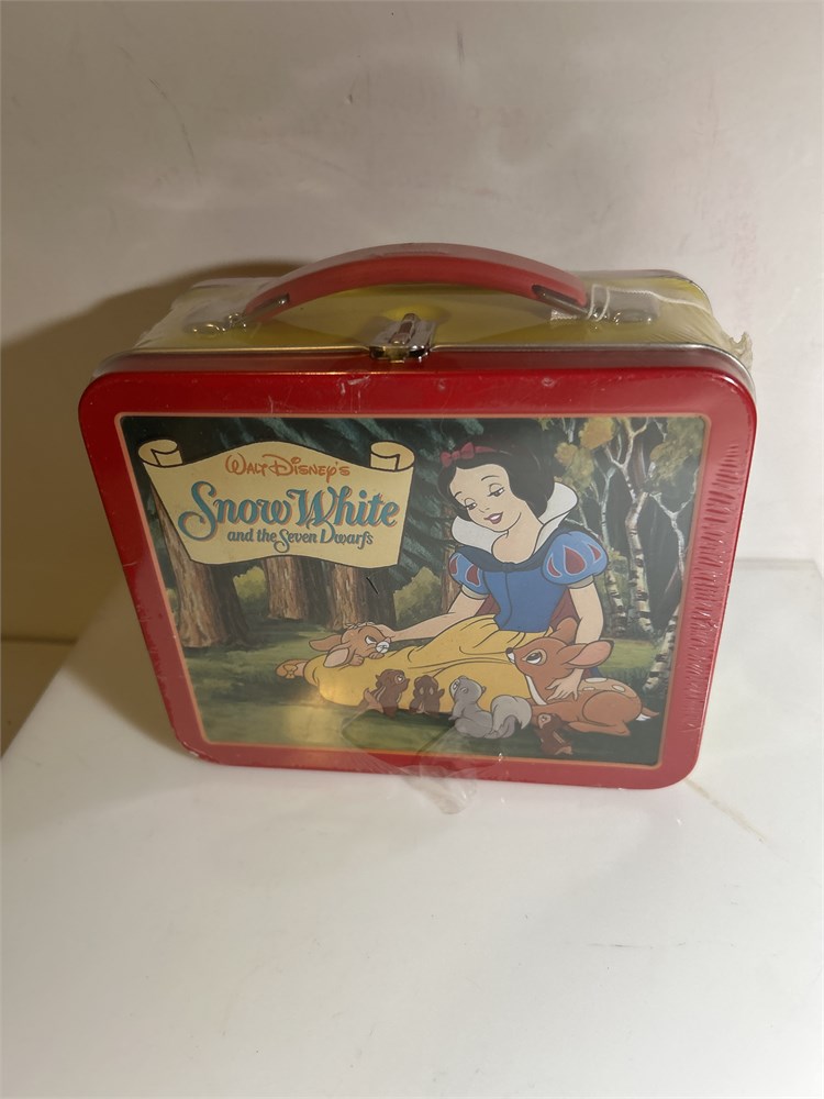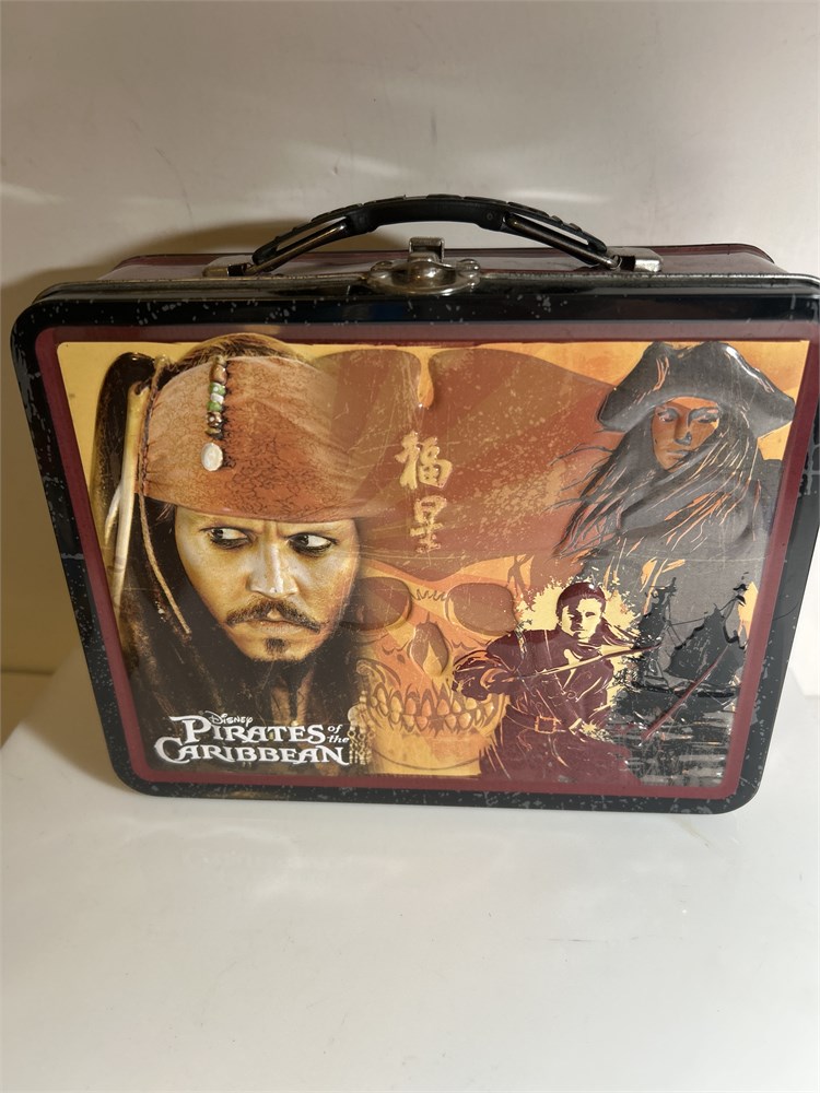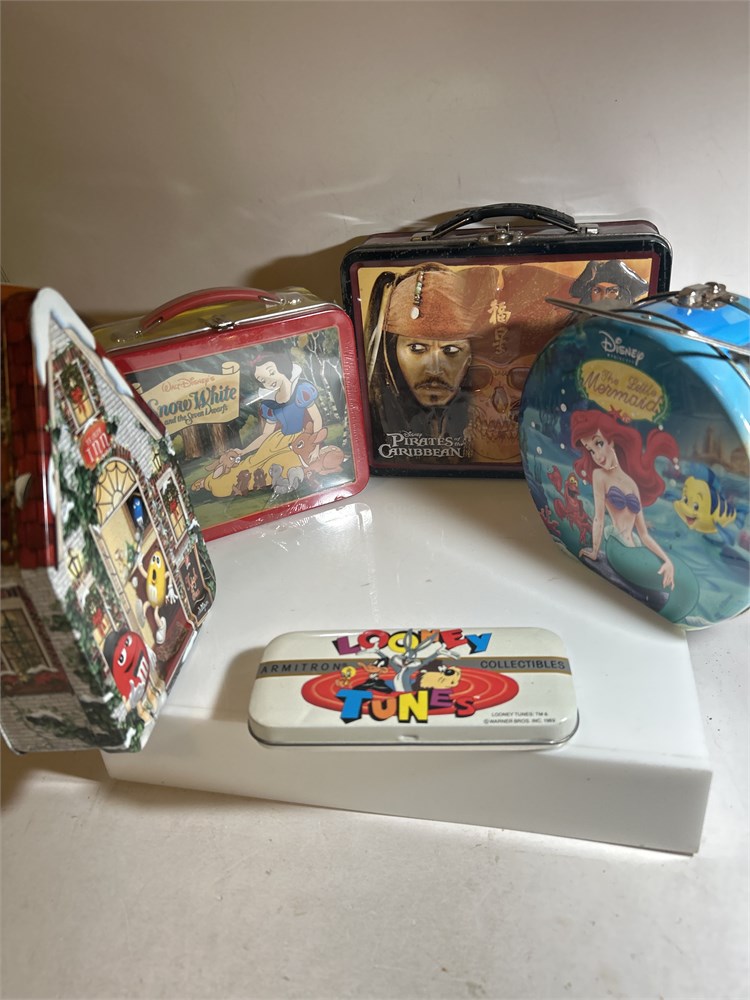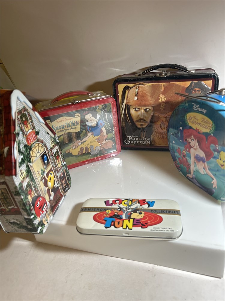 Disney Pirates of the Caribbean lunchbox, Snow White, and the seven dwarfs lunchbox unopened M&M Vintage tin Looney Tunes, flexible tin, and vintage Disney the little mermaid lunchbox