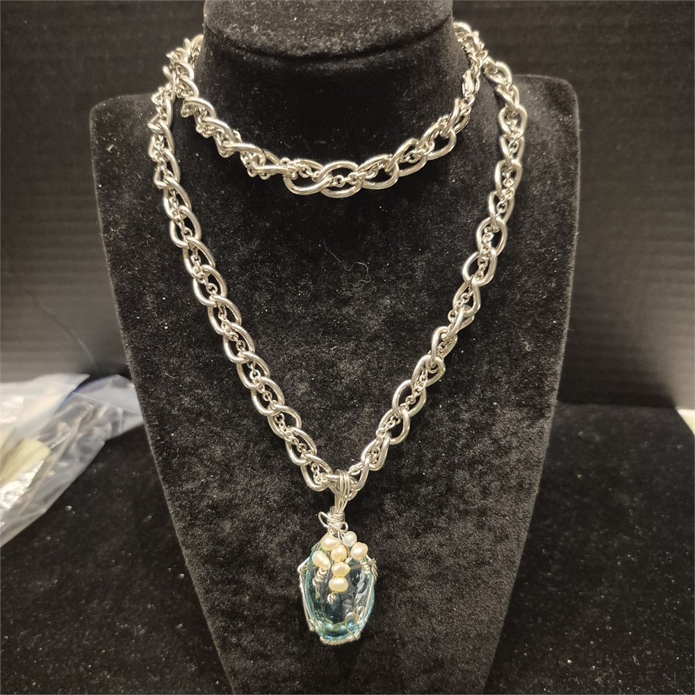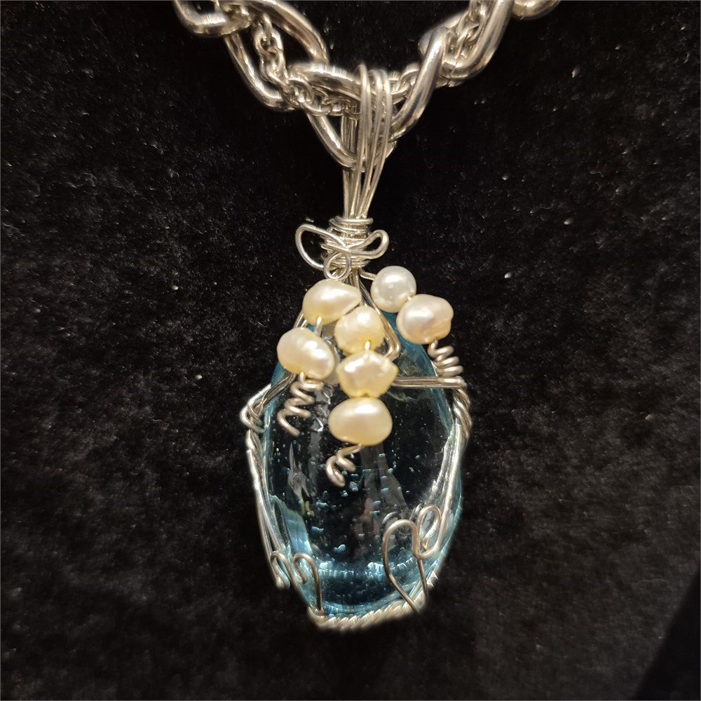 Stunning Aquamarine PENDANT wrapped sterling ~ on 3 beaded Necklace