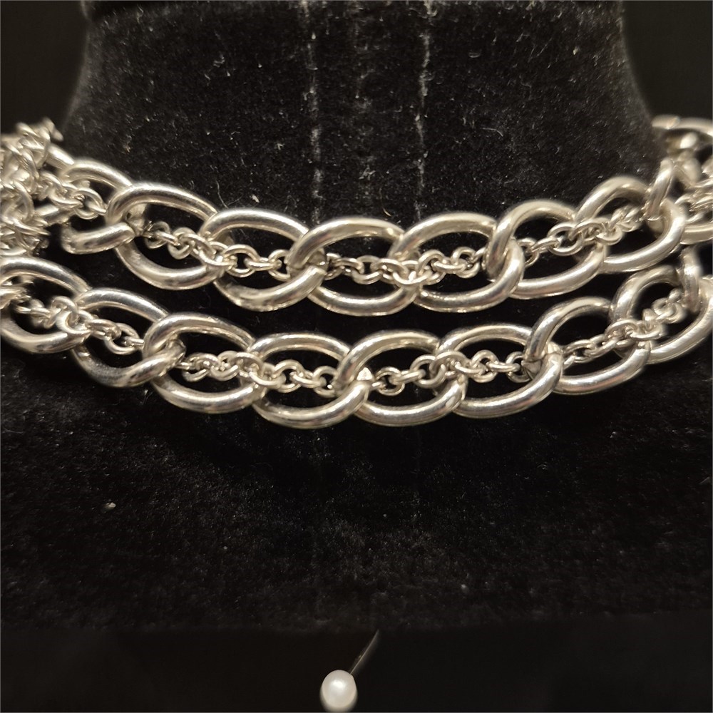 > necklace is a 3 strand wrapped unit with small cluster of pearls atop