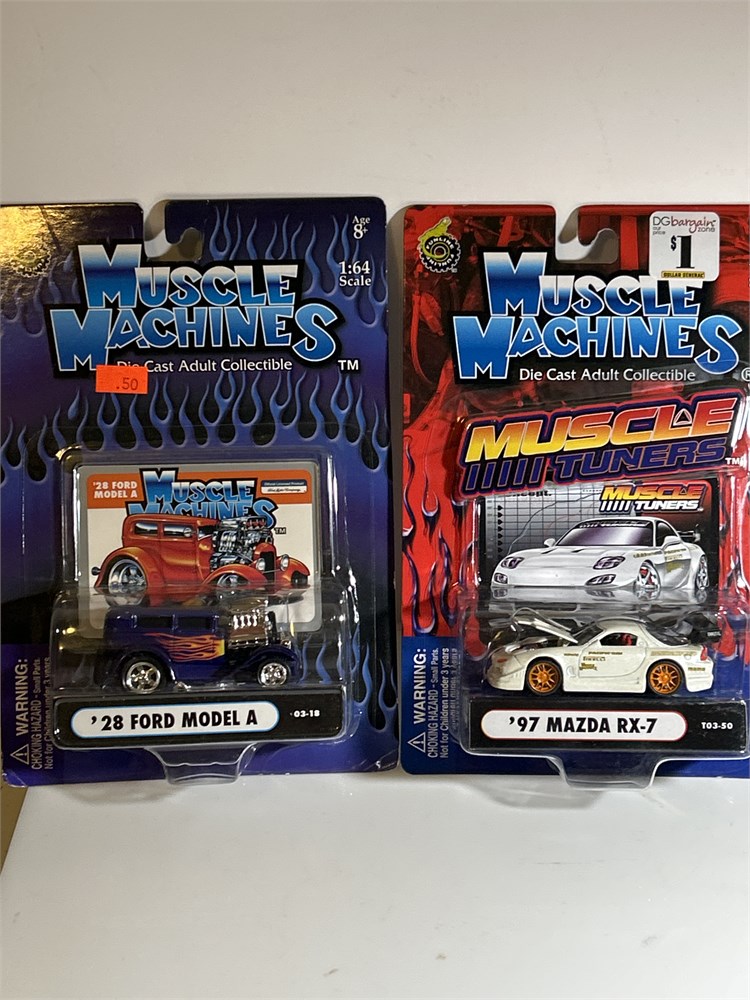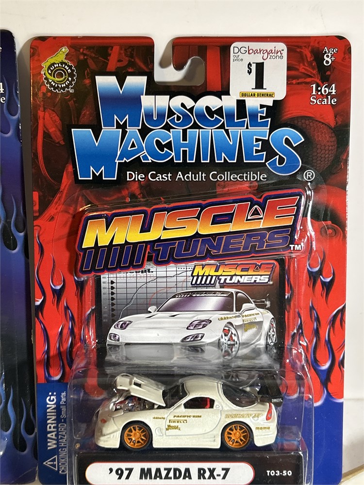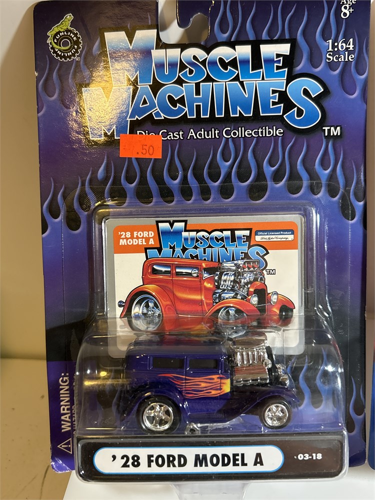 Muscle machines 28 Ford Model a blue with flames And Mazda 1997 RX seven white And orange rims