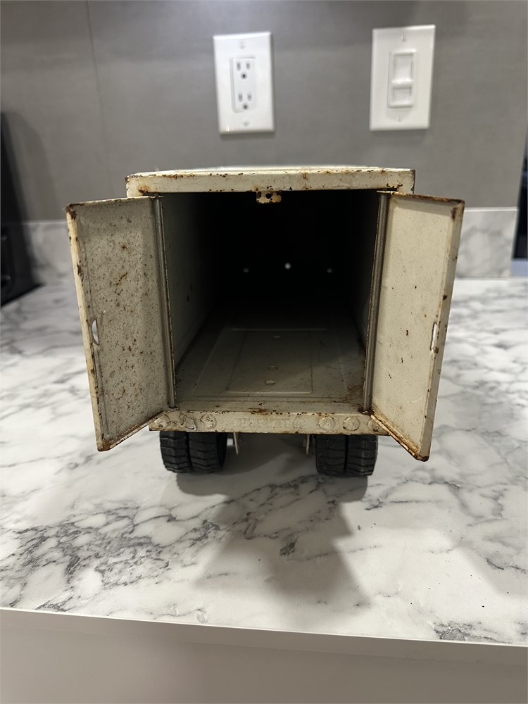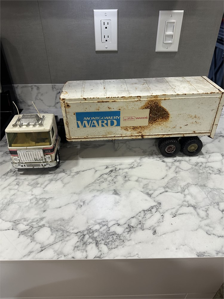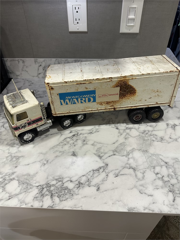 vintage Ertl pressed steel toy semi-truck and trailer, featuring the Montgomery Ward logo on the side of the trailer. The truck is an International model, and the trailer is a box trailer with opening rear doors