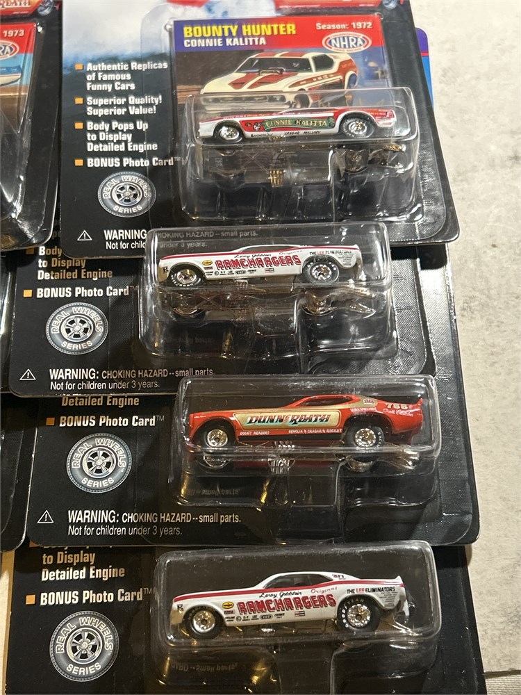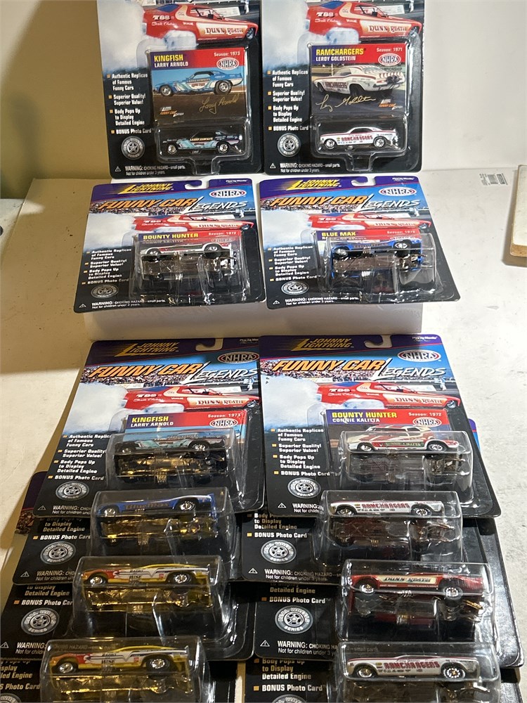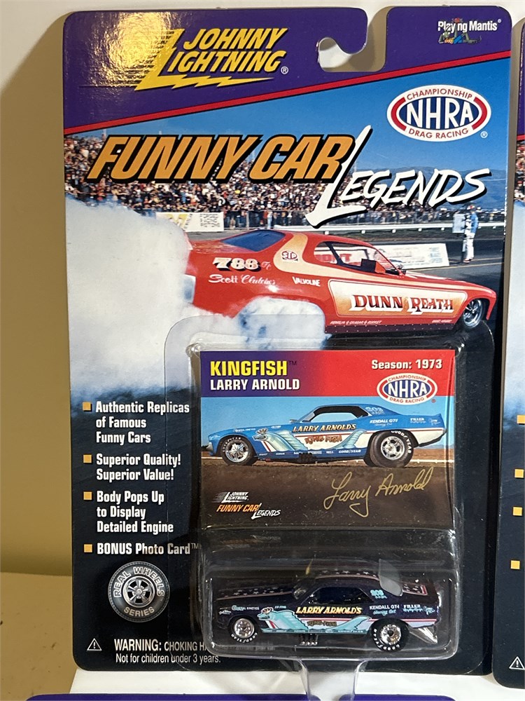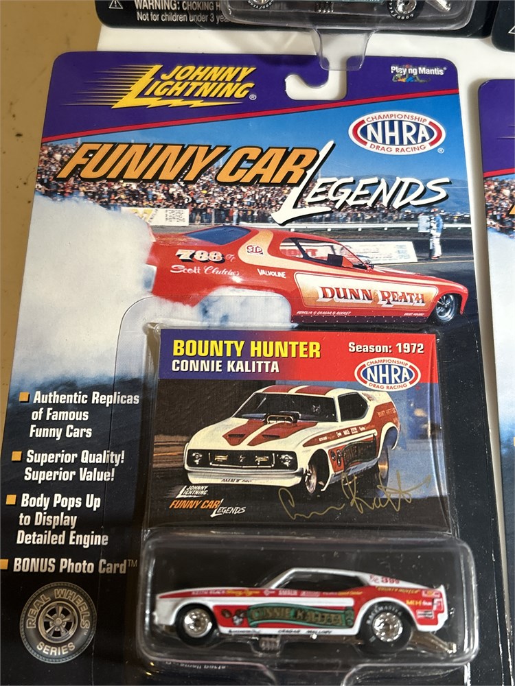 One full case of 12 assortment, funny cars  1/64 JONNY LIGHTNING LEGENDS BOUNTY HUNTER CONNIE KALITTA 1972 Racemaster Tires  Johnny Lightning Blue Max Raymond Beadle WHITE LIGHTNING Funny Car Legends