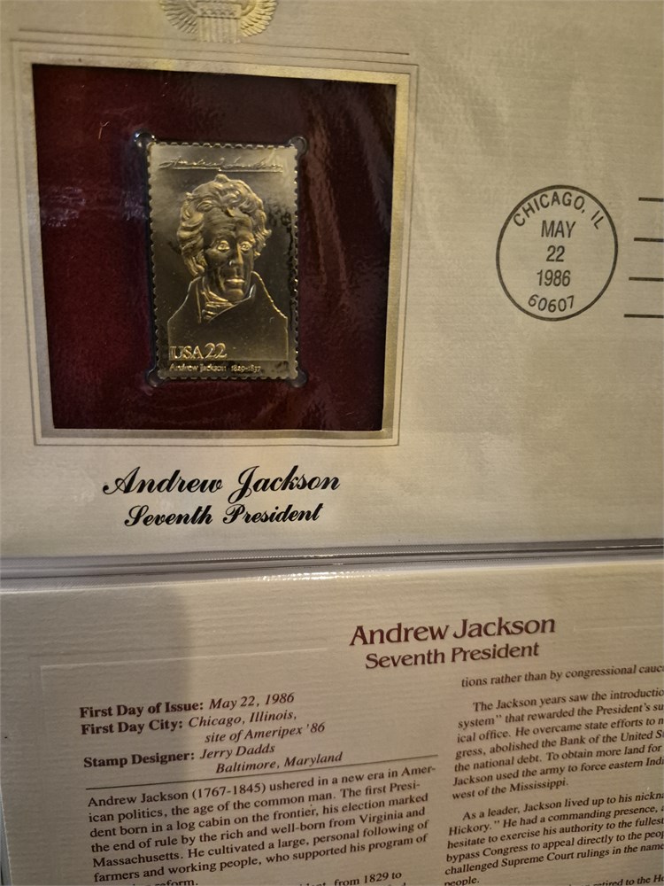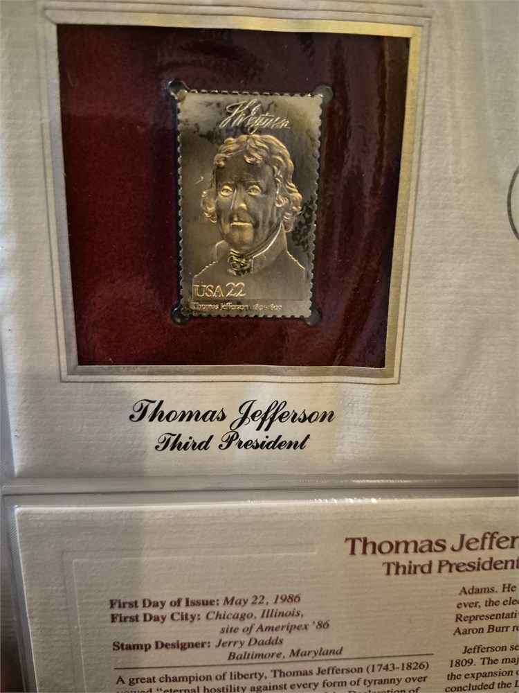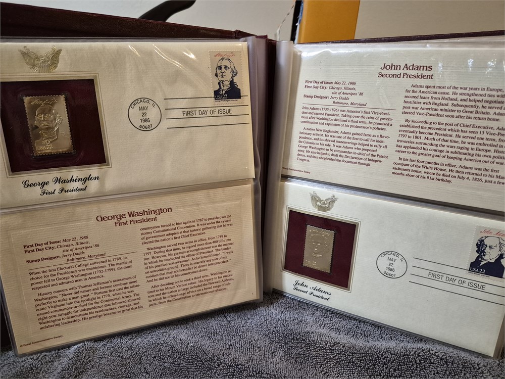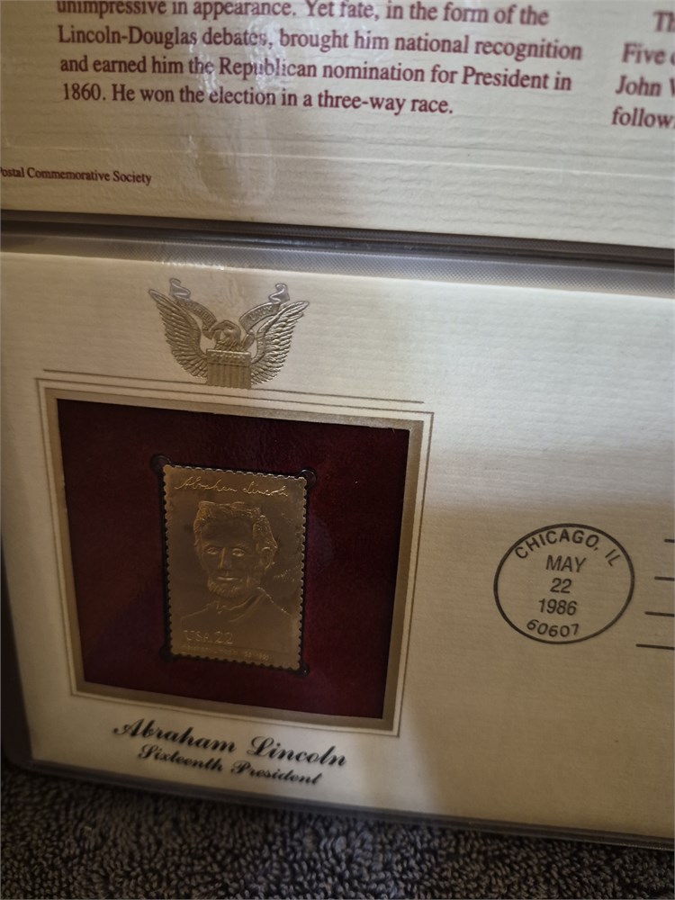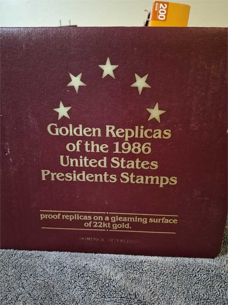 Golden Replicas of the 1986 United States Presidential Stamps.