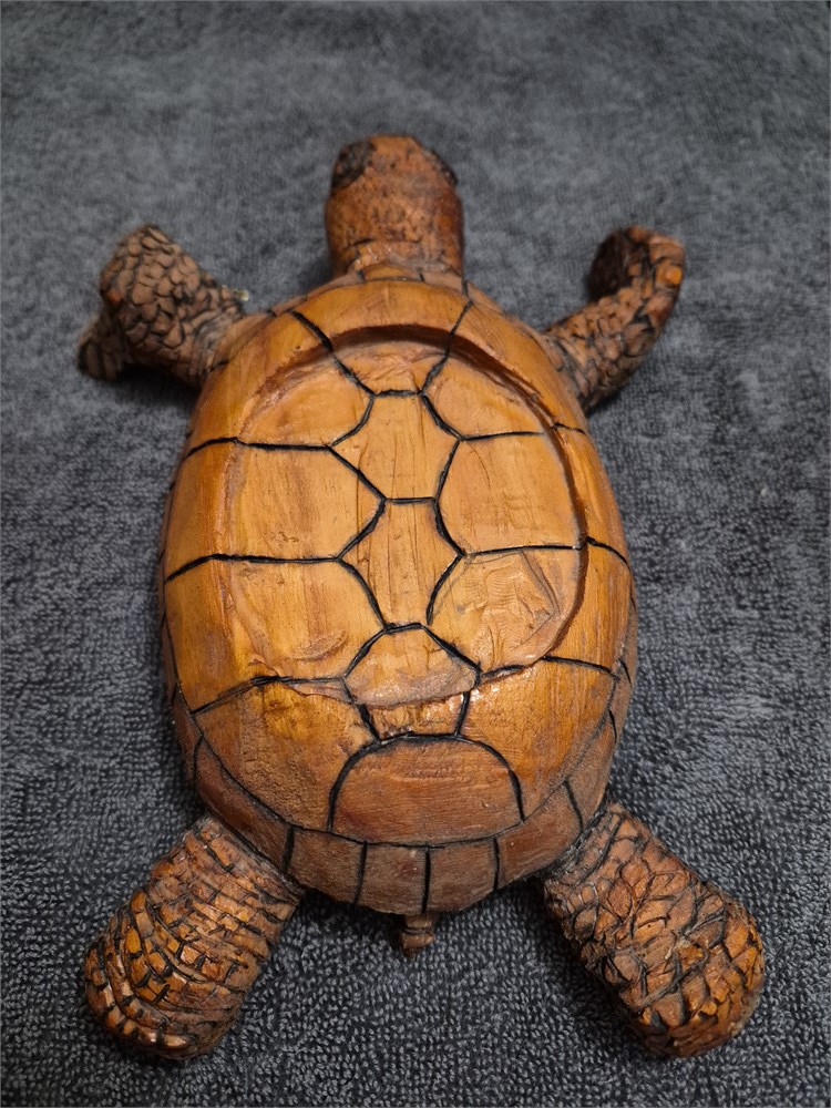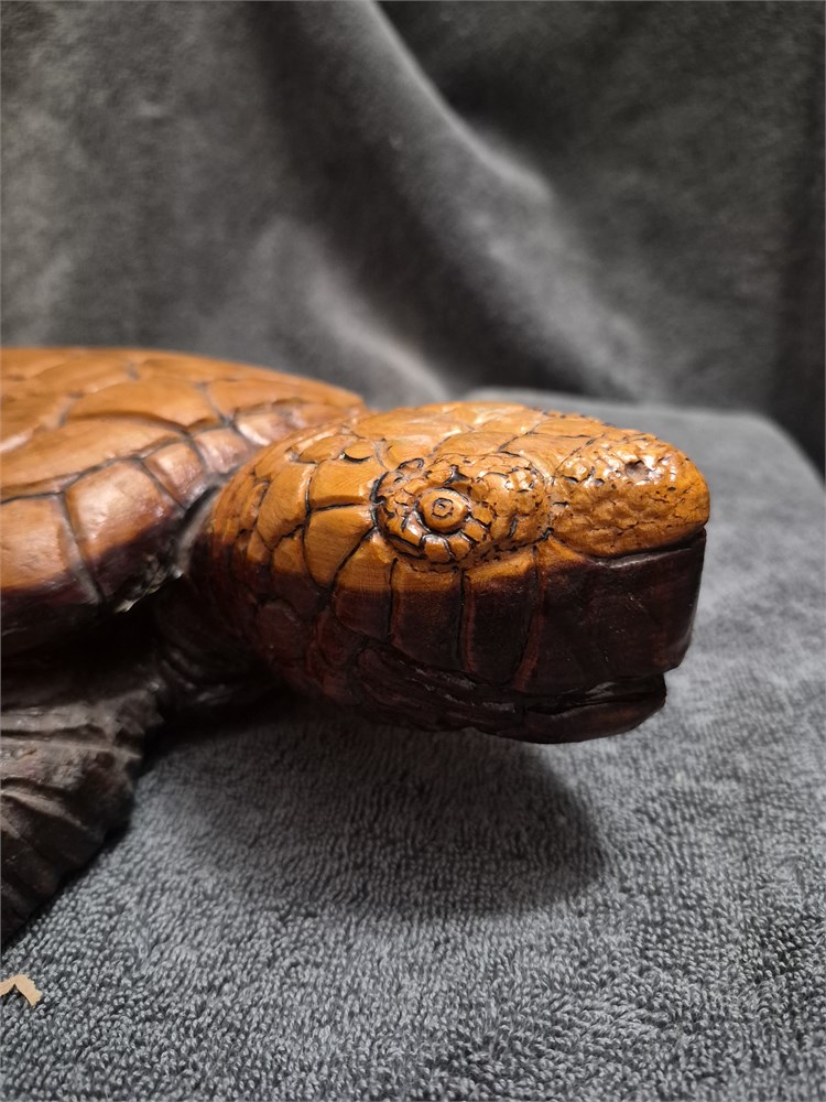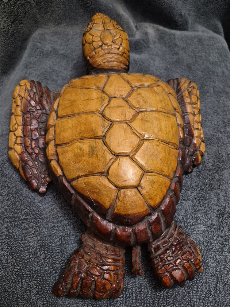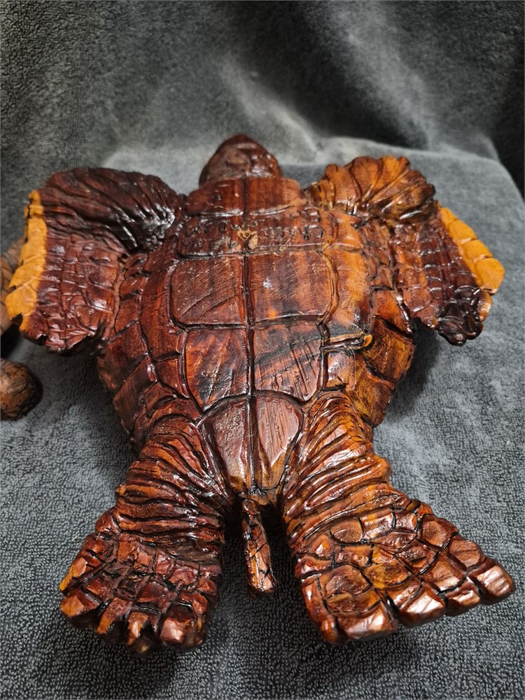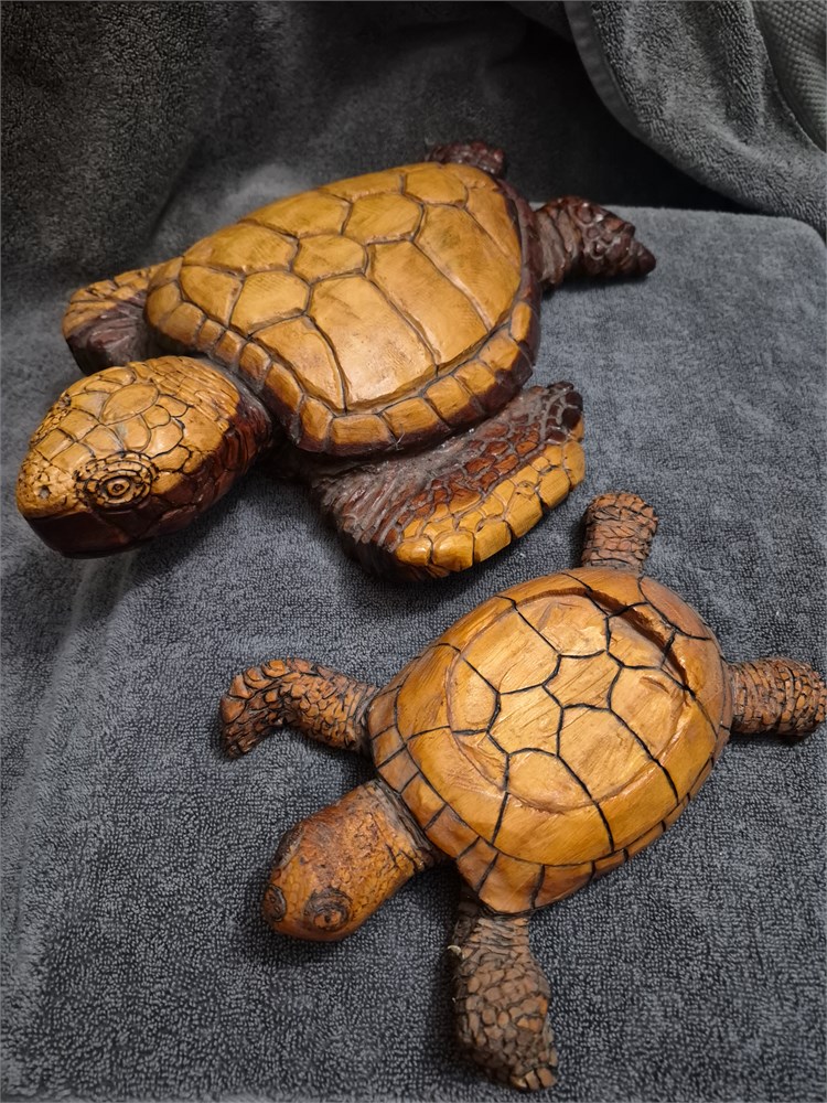 Two Hand carved sea Turtles. Larger Turtles measures 14" ling and smaller Turtles is 9" long.
