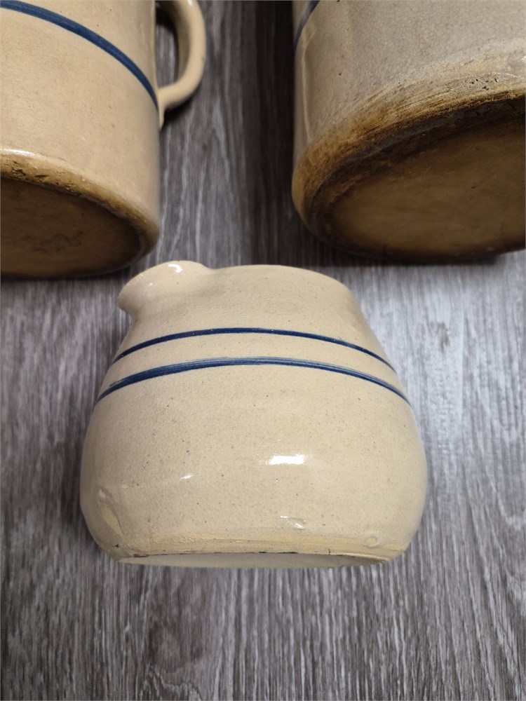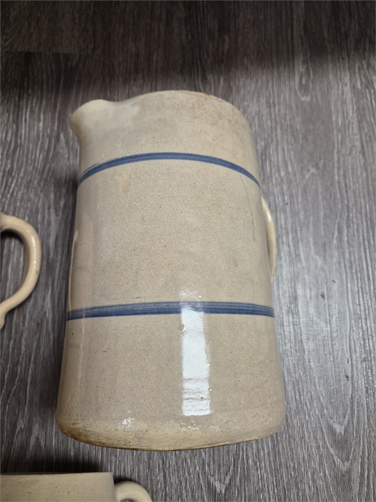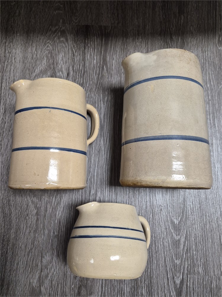 Three very nice stoneware pitchers. The largest is 11".
