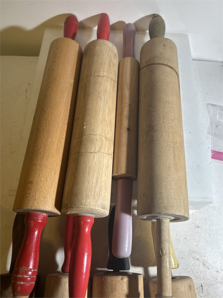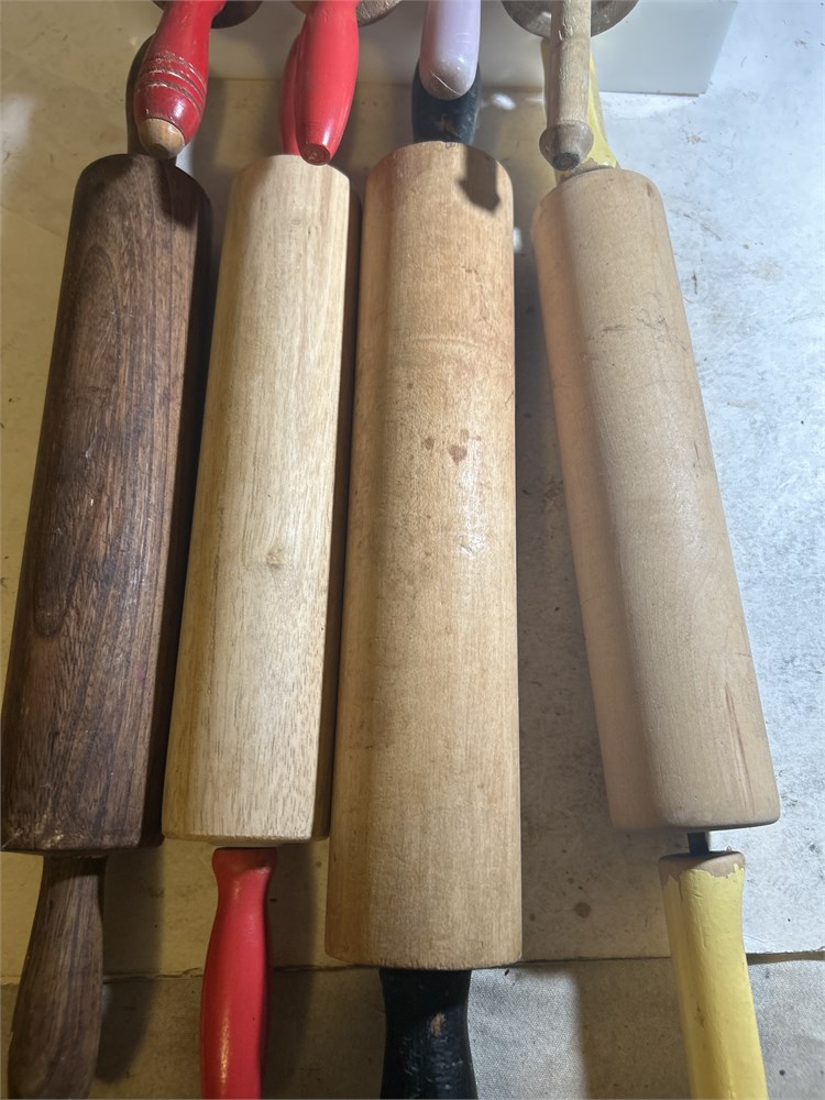 Vintage all wood rolling pin with red handles, primitive, 15" long, sweet! Eight total red handled black handles, yellow handles, purple handle wood handles very nice ass assortment