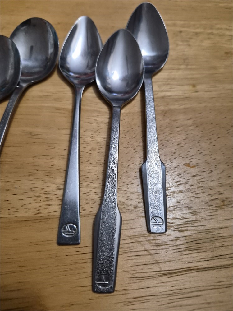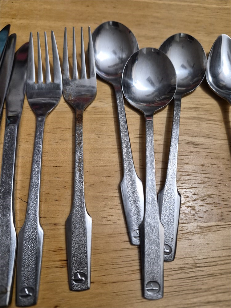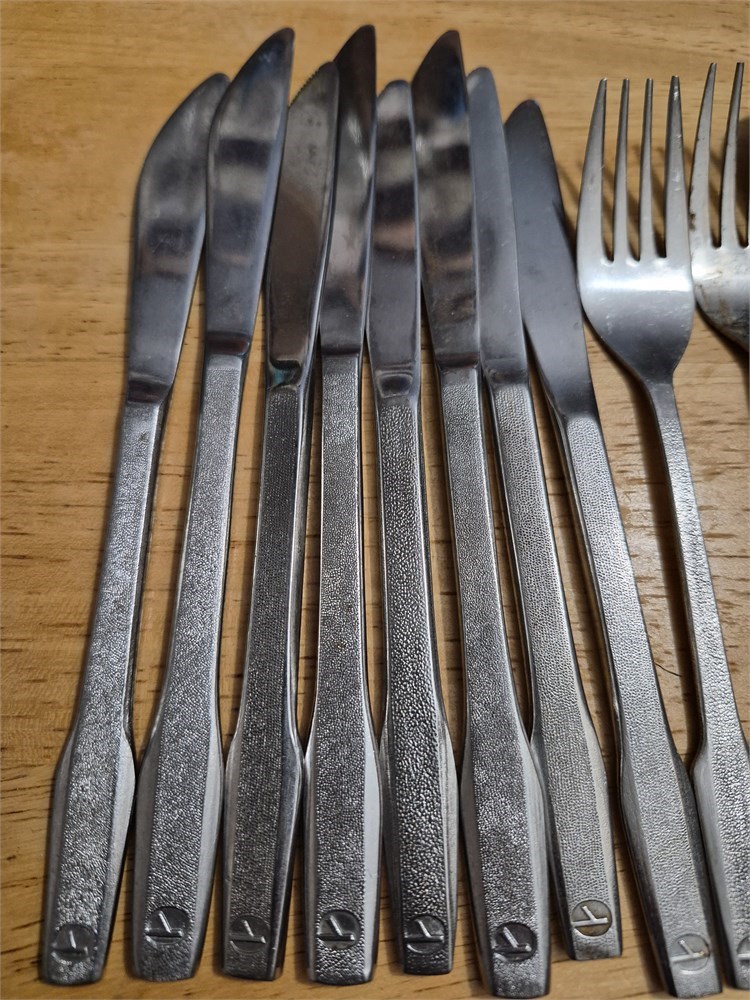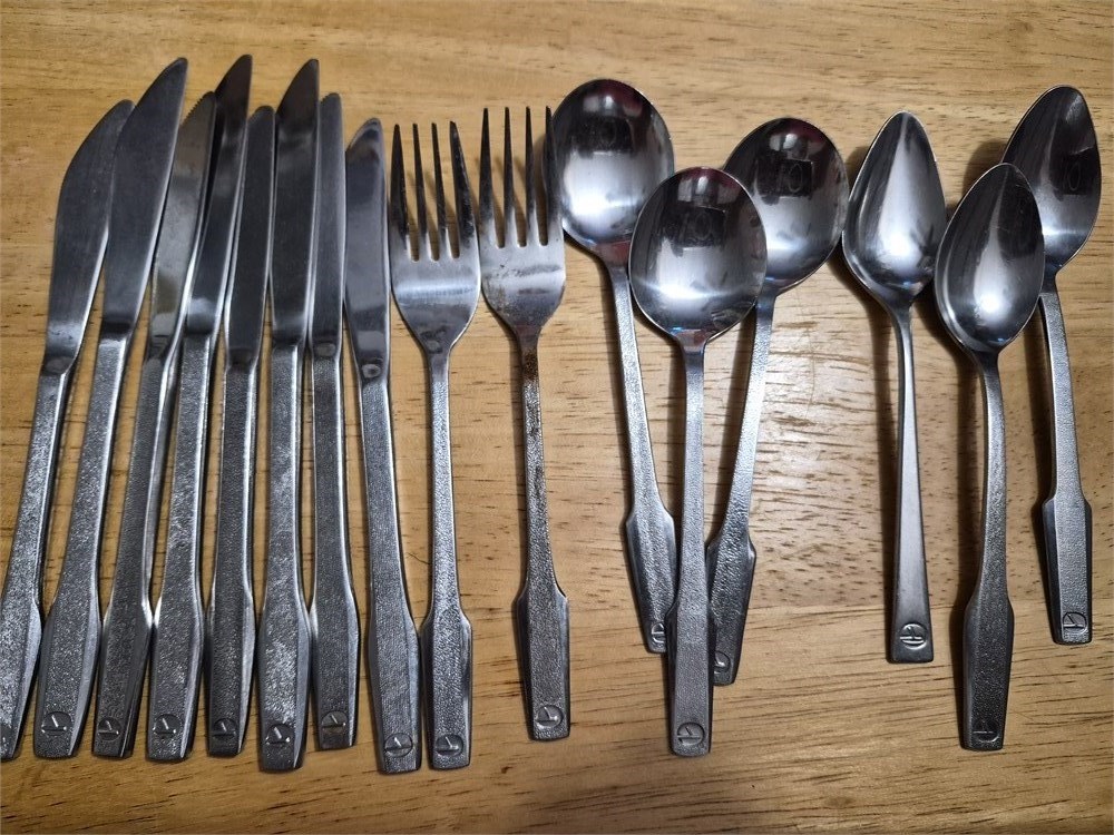 Vintage lot of TWA silverware. There are 15 pieces total. There are eight knives two forks three soup spoons and three spoons.